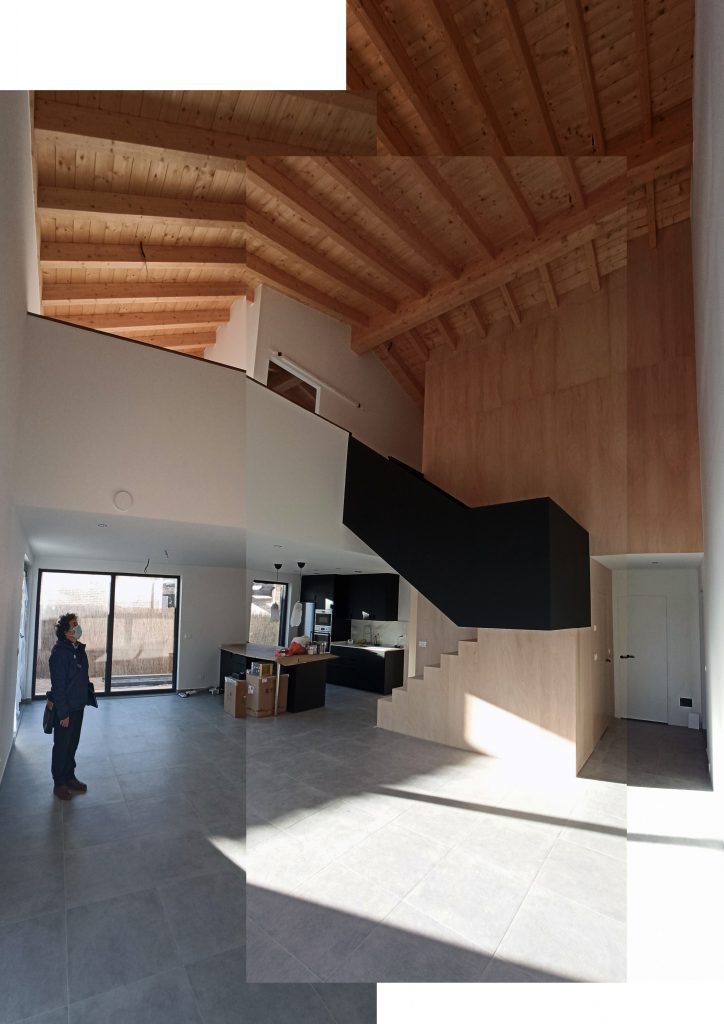La idea primaria de formalizar la casa como si fuese un barco navegando por el canal se ha plasmado en dos elementos diferenciados: la quilla de madera como plano de referencia base y las formas geométricas que emergen «aleatorias» sobre ella. Referencias al Movimiento Moderno, el estilo arquitectónico racionalista, pero también a la Arquitectura Vernácula, más enraizada con el territorio y nuestro entorno rural.