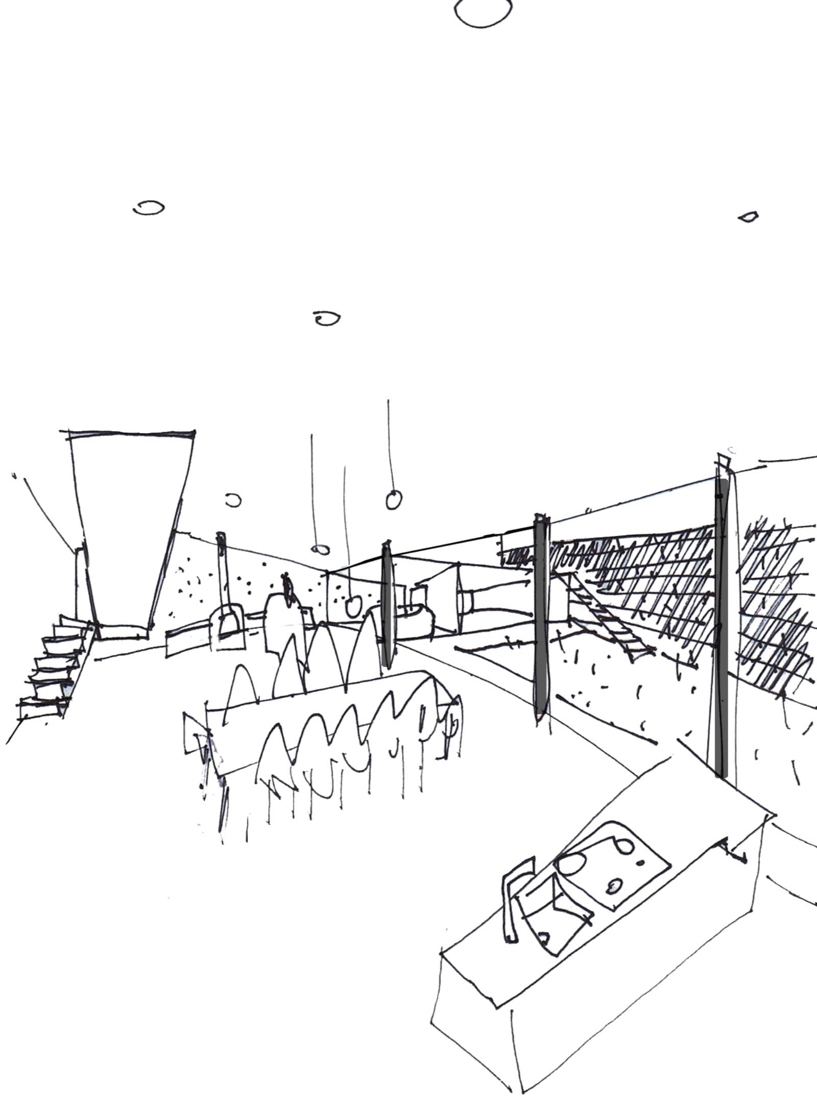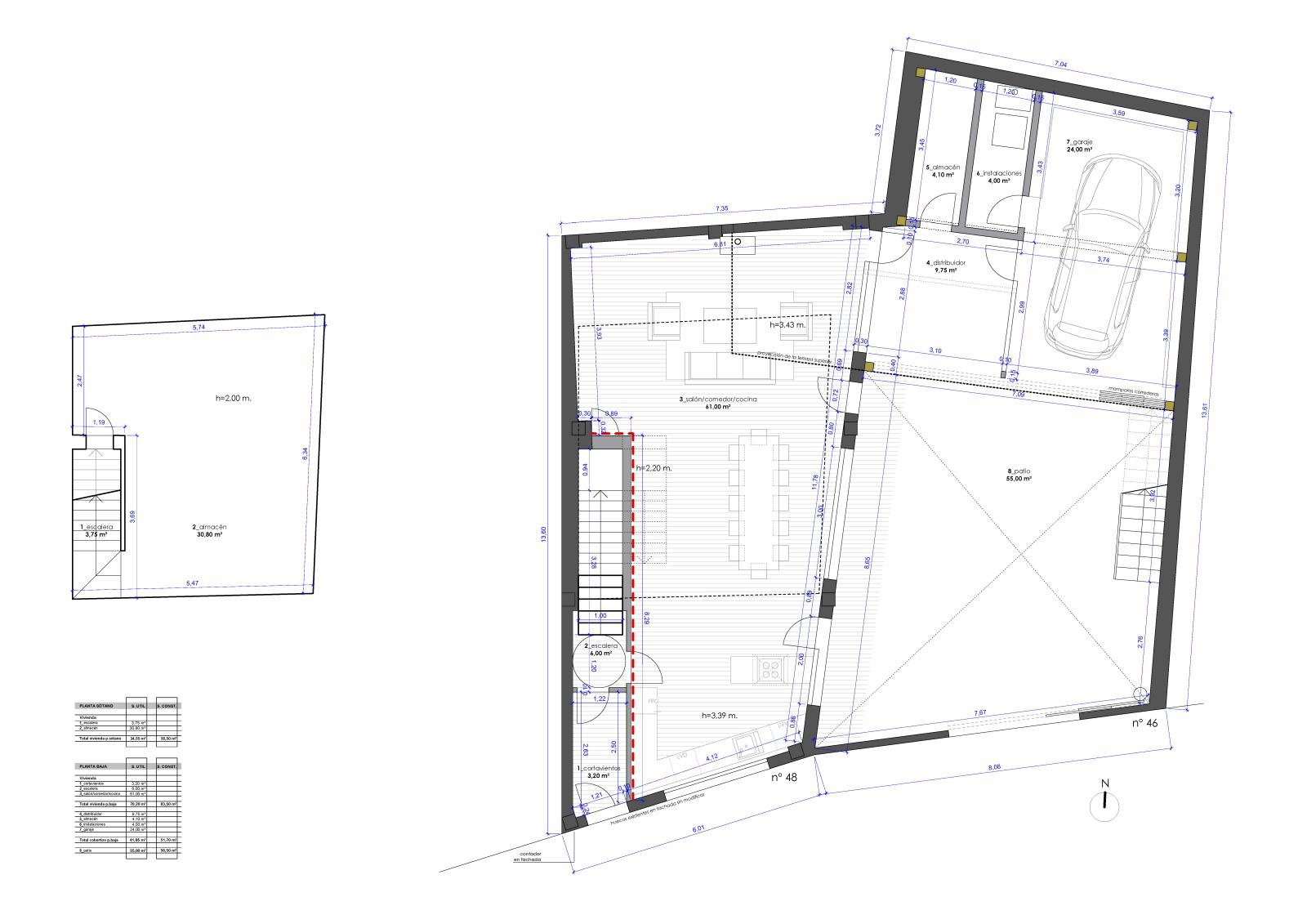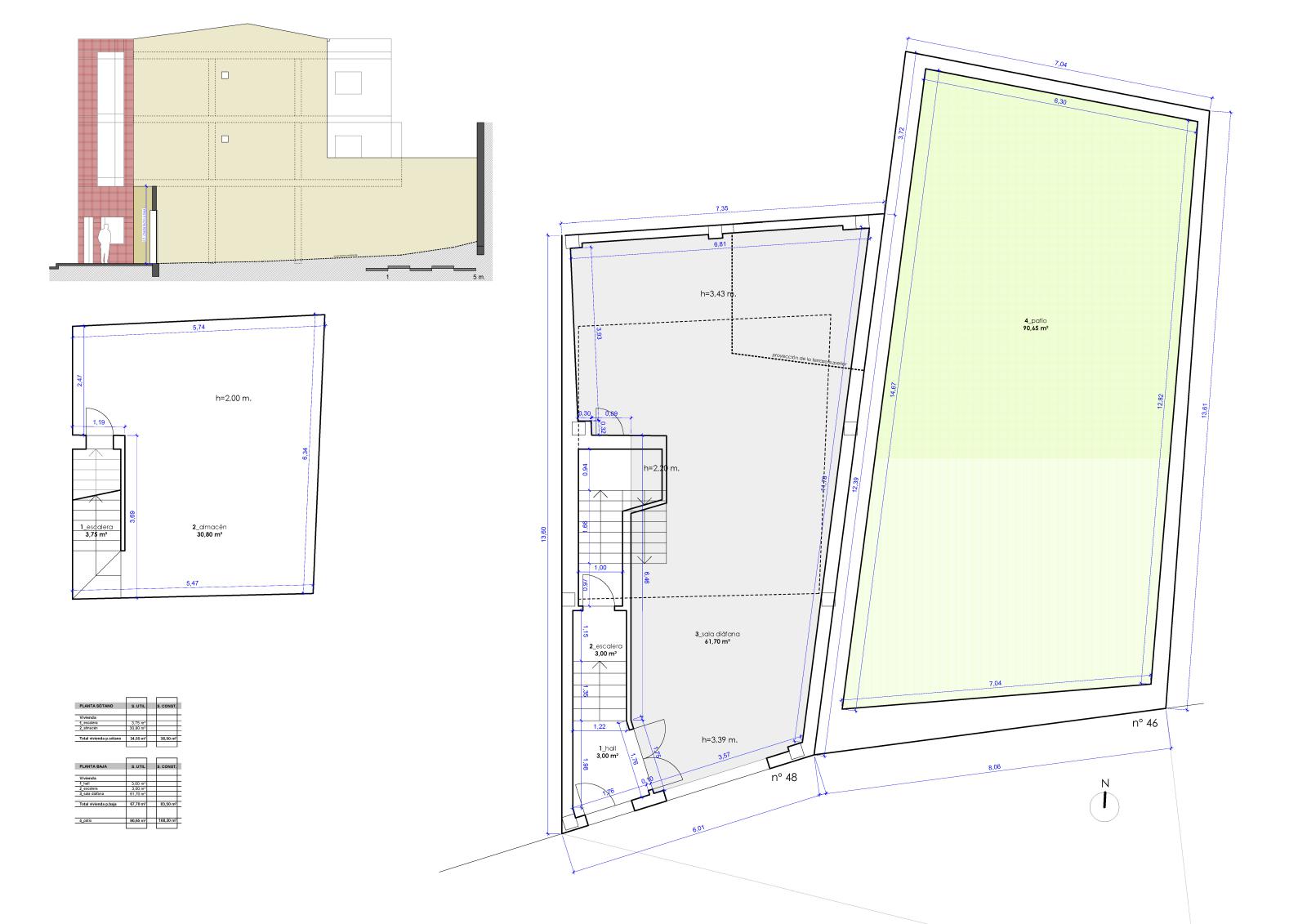 Para completar la intervención, se ejecuta un cobertizo en el interior de la parcela contigua que sirva para completar las exigencias básicas de funcionamiento y almacenamiento de la planta baja además de aquellas que se pudieran derivar del uso del espacio libre del patio. Para ello se distribuye una zona de garaje con espacio mínimo para un vehículo, sala de instalaciones, almacén y distribuidor para conectar con el espacio acondicionado en planta baja de la vivienda contigua.