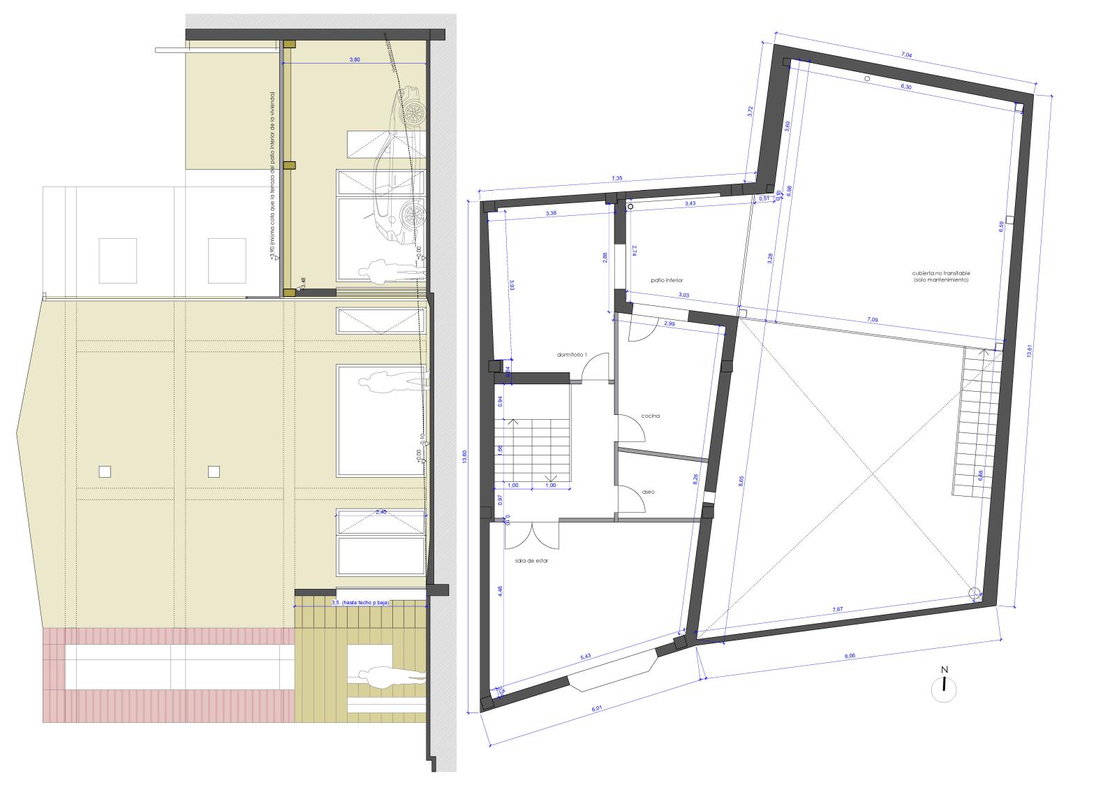 La intervención se desarrolla en dos fases; por un parte la reforma de la planta baja de la edificación y por otra la ejecución de un cobertizo en la parcela contigua.