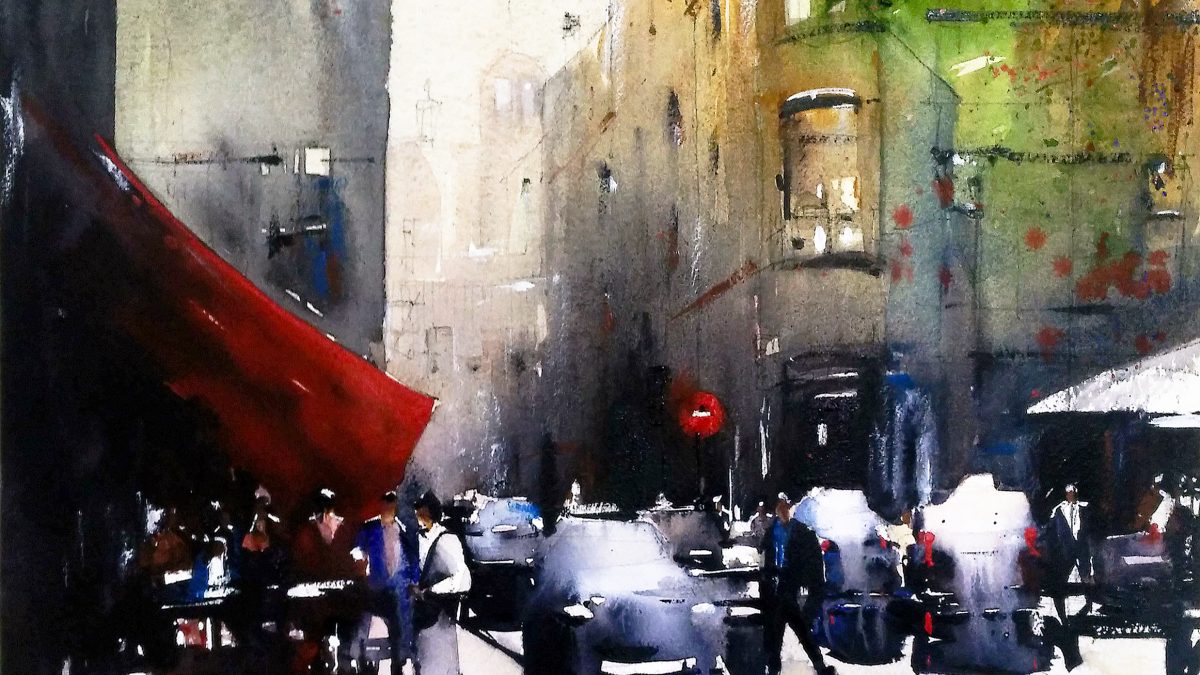 Personalizada escena urbana sobre el conocido Café «La Nuit» de Arlés, establecimiento pintado por Van Gogh en su famosa obra nocturna. Tonos saturados que varían entre cálidos y fríos para crear claroscuros de gran profundidad y distancia. Se pone el foco de atención en el llamativo toldo del Café, reinterpretado en color rojo.
