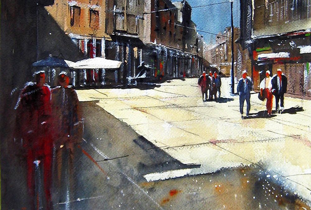 Escena urbana sobre la conocida calle palentina. Grandes contrastes y un primer plano en sombra para fijar la atención en las edificaciones tradicionales fuertemente iluminadas.