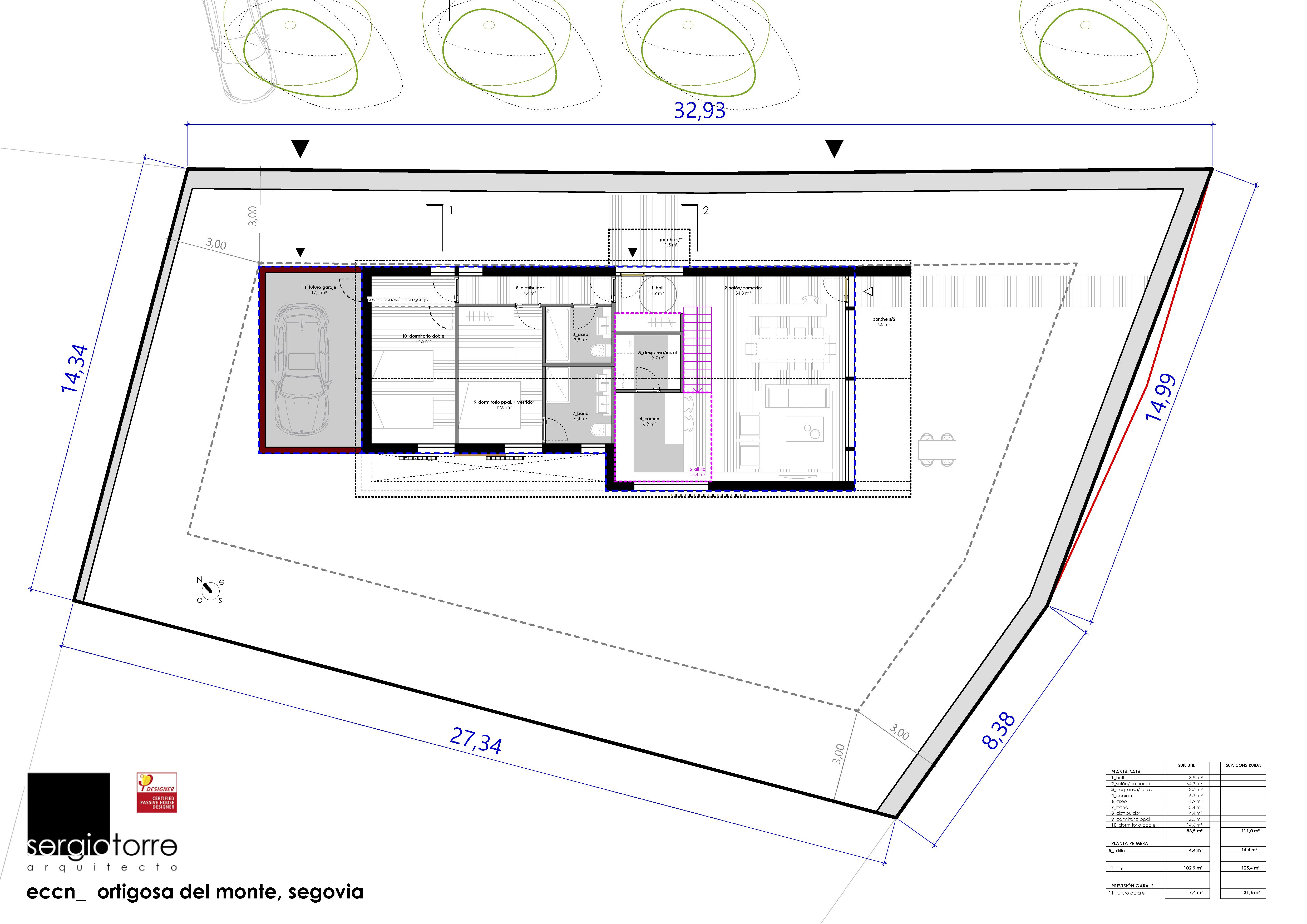 - El volumen principal se posiciona dentro de la parcela de la manera más eficiente posible desde el punto de vista energético (consumo energético casi nulo (ECCN)) pero sin obviar cuestiones estéticas o funcionales.