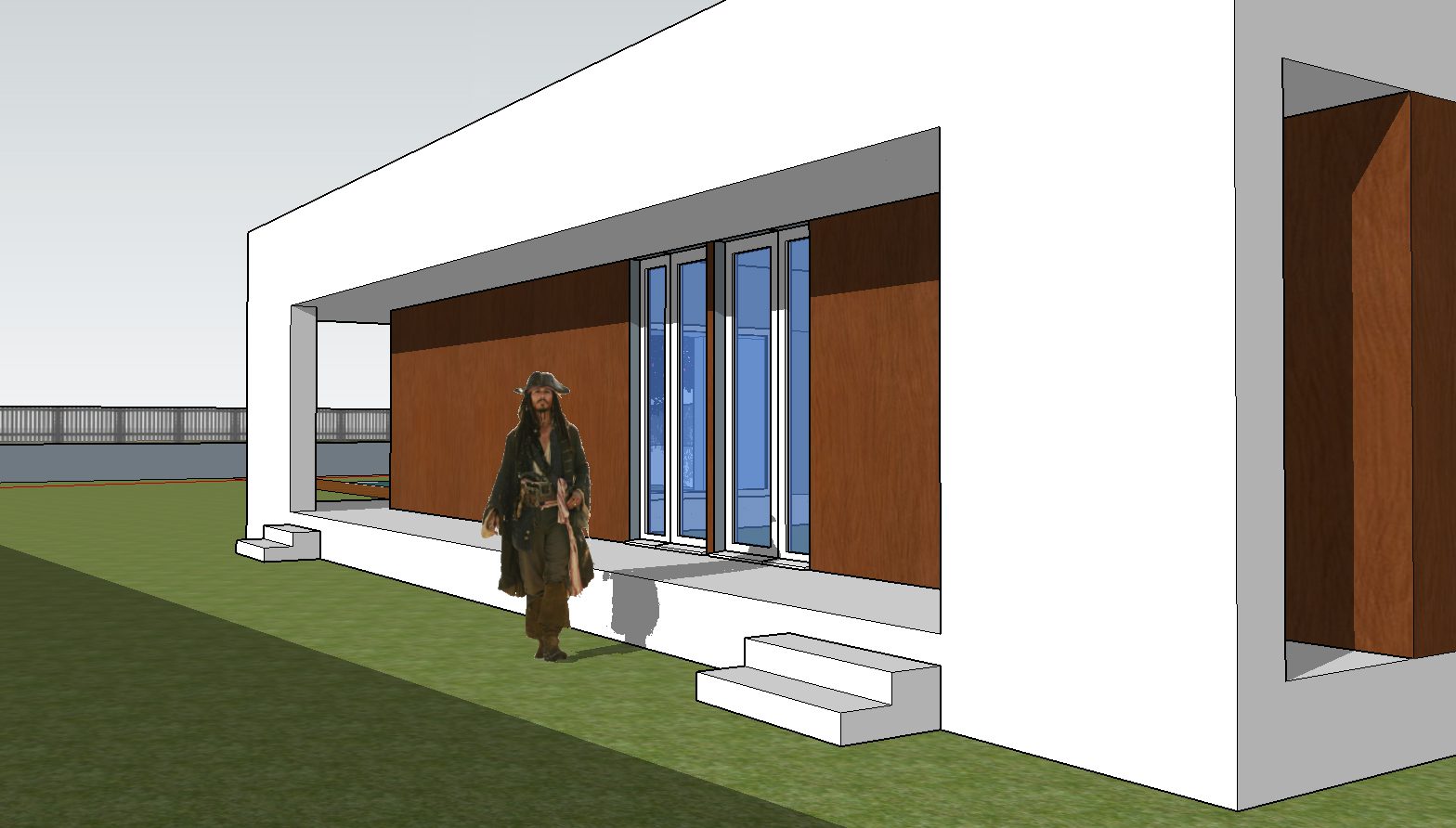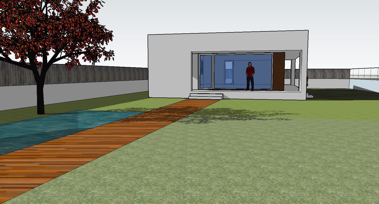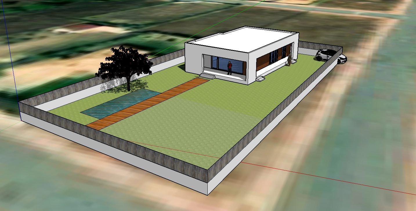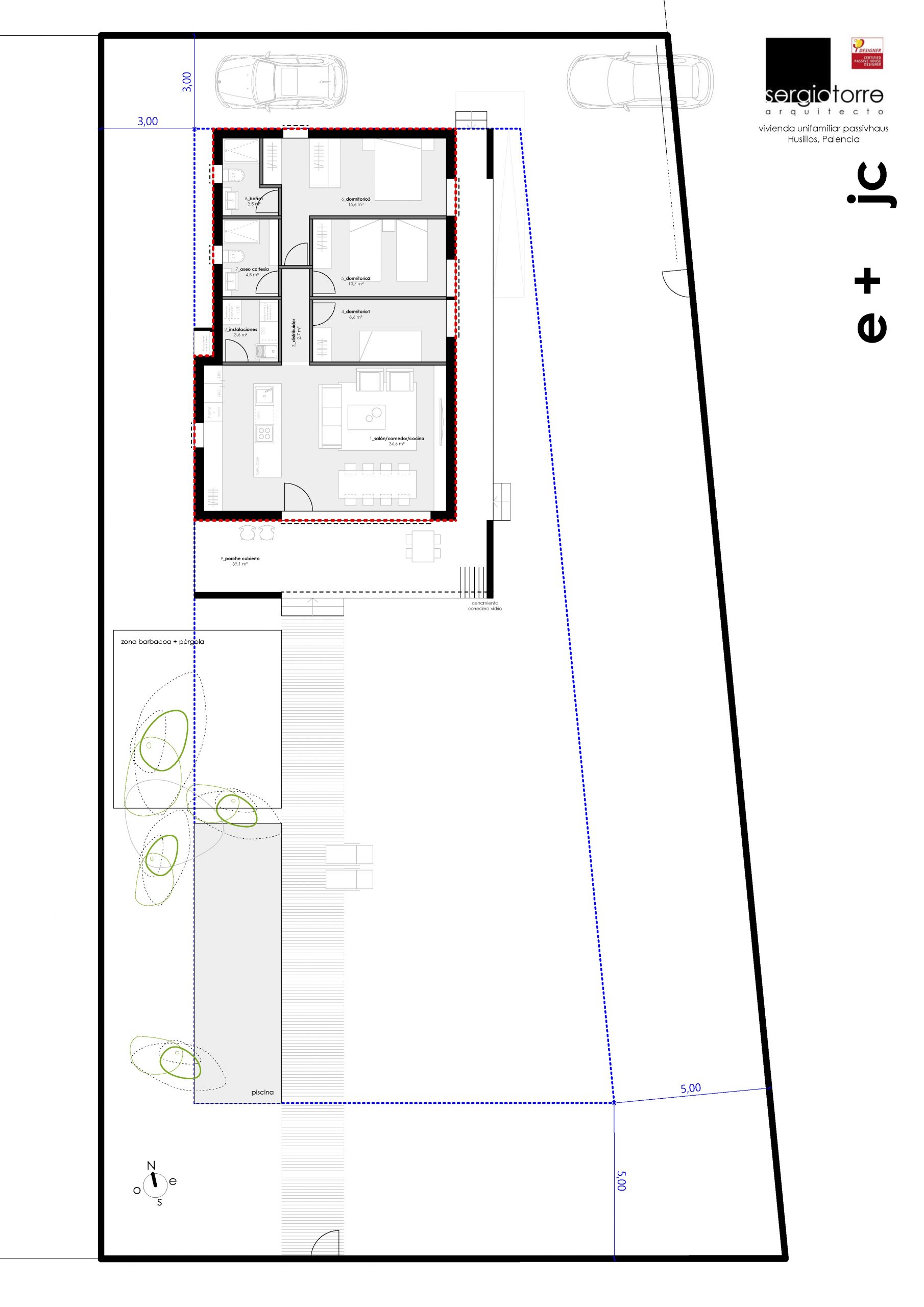 Su tipología aislada permite plantear las aperturas y sombreamientos según la orientación necesaria. Se accede a la vivienda mediante un porche perimetral que evita el sobrecalentamiento en periodo estival. Se disponen al sur y este las distintas estancias principales, salón/comedor y dormitorios, que se abren al jardín con sus aperturas de suelo a techo. En la orientación opuesta se disponen los cuartos húmedos separados mediante una crujía de recorridos y almacenamiento.