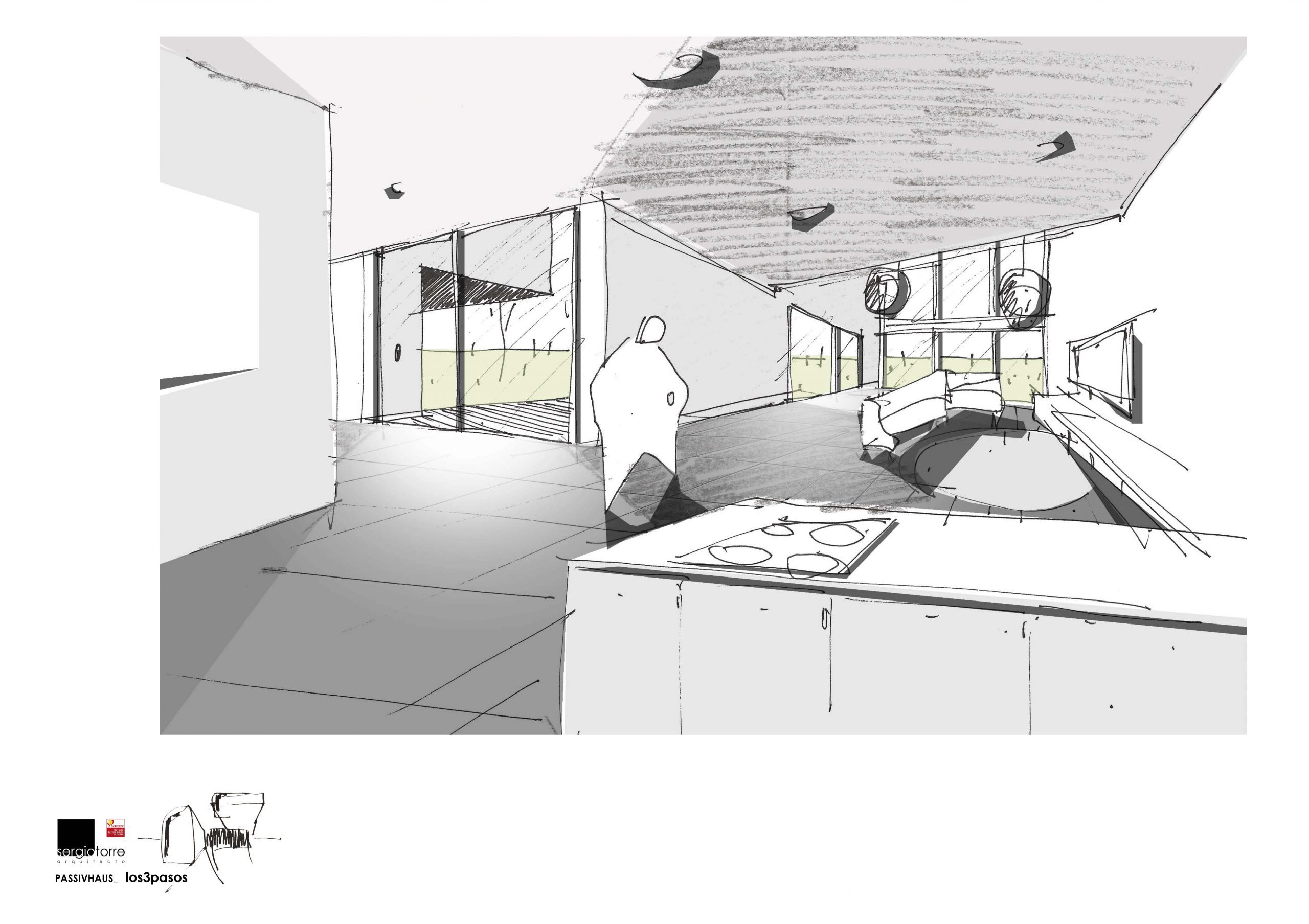 La vivienda pasiva muestra su geometría de volúmenes puros de manera coherente y sin ornamentos. Una pieza a dos alturas se asienta sobre el terreno y conforma los espacios de día. Se conecta tangencialmente con una segunda pieza, ésta suspendida, que configura las zonas de noche. Diversos vacíos espaciales generan entre sí una volumetría pura y funcional en forma centralizada, acondicionada al entorno, a sus vistas y orientaciones.