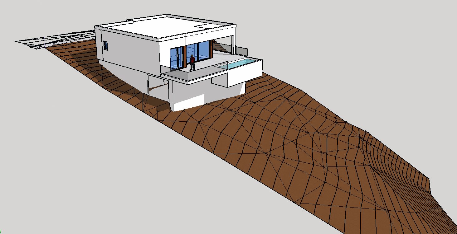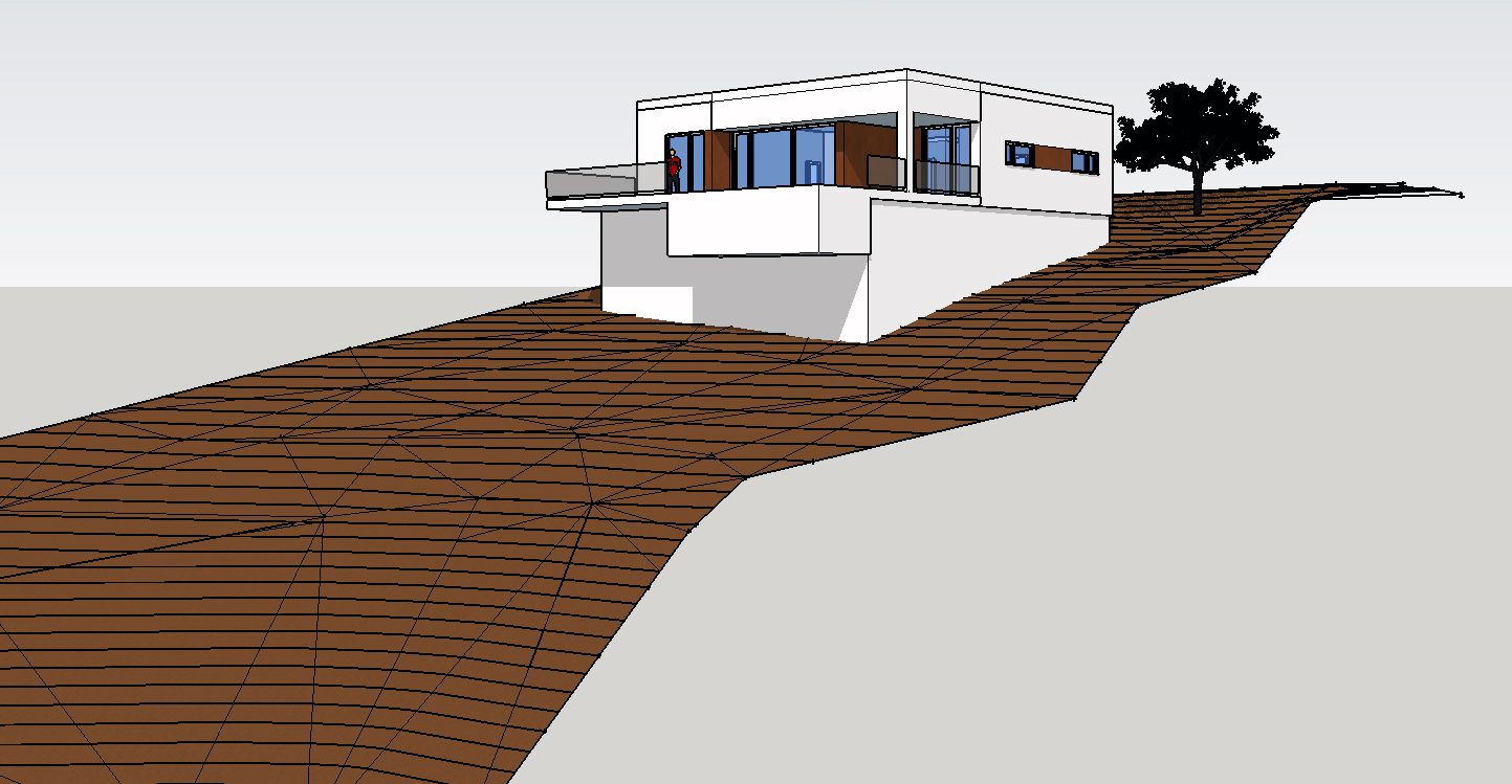 La parcela, con su pronunciada pendiente, origina en gran medida la respuesta programática y de diseño. La disposición de la parcela, permite volcar la vivienda sobre el paisaje, sus vistas y su óptima orientación.