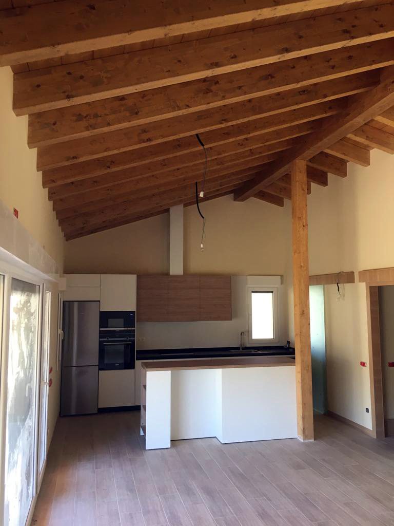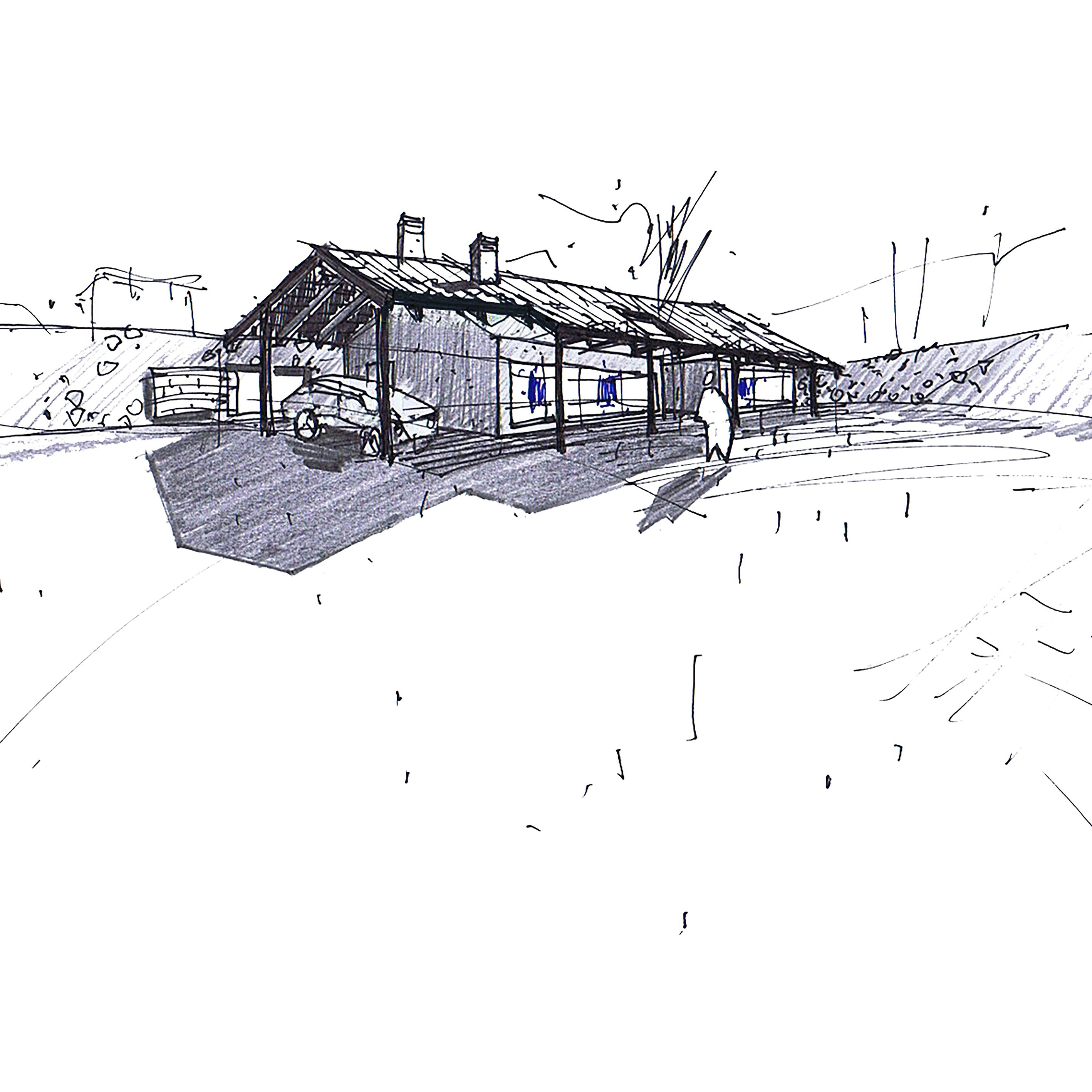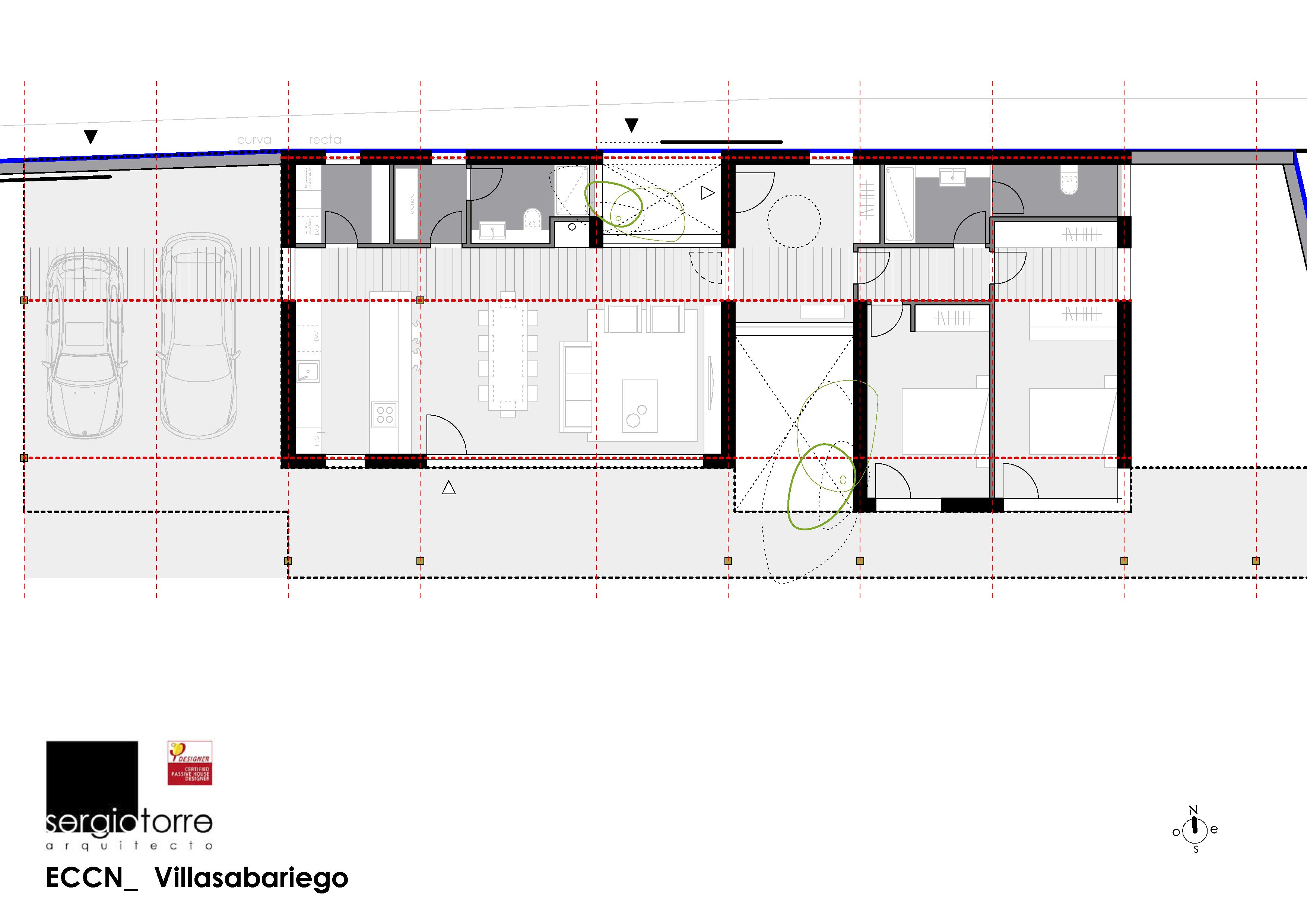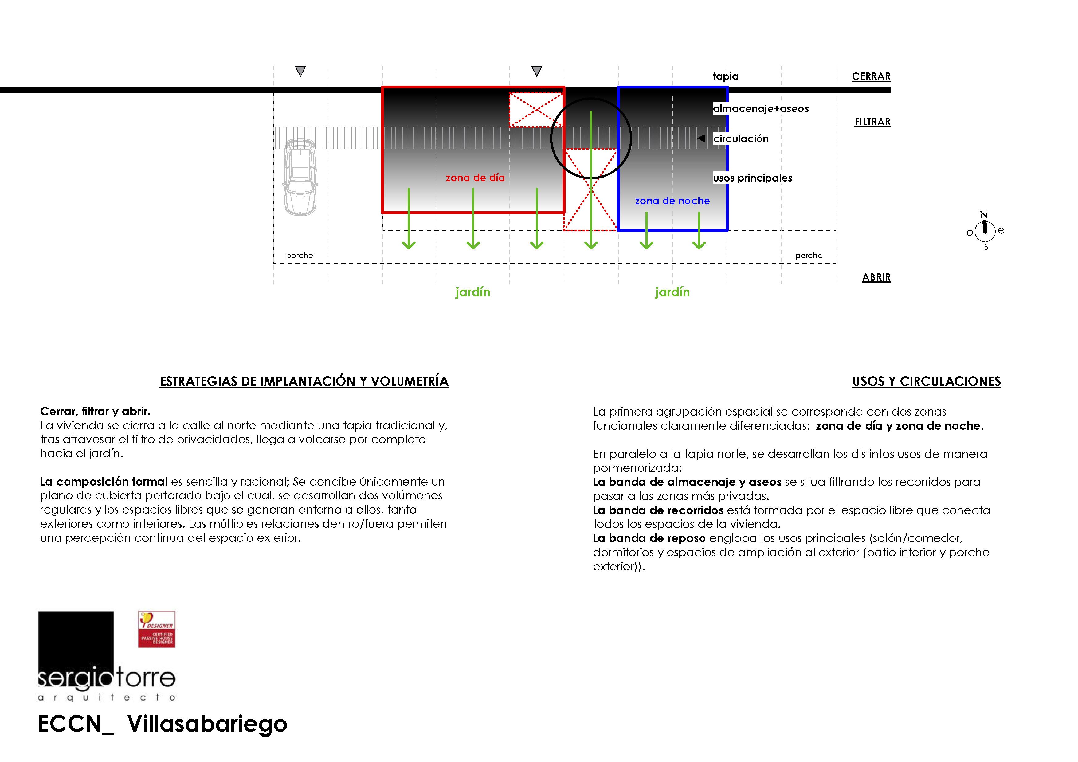 Una tapia tradicional cierra toda la parcela al norte y sirve de apoyo a una cubierta inclinada que engloba dos volúmenes. El primero se corresponde con la zona abierta de día; salón, comedor, cocina y espacios anexos. El segundo, más privado y filtrado, engloba la zona de noche; dormitorios y aseos. En posición centrada a modo de charnela, se sitúa el espacio negativo de acceso que conecta ambas zonas, tensionando interior y exterior.