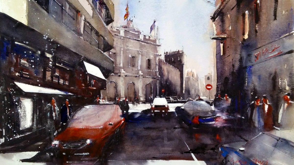 Escena con una fuerte perspectiva que enmarca el conocido edificio de la capital palentina como foco principal de atención. Las sombras del primer plano mantienen todas las áreas de luz unidas.