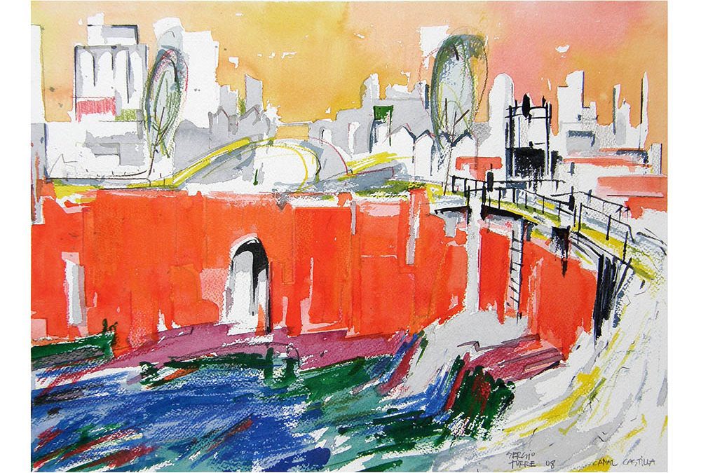 Recreación colorista del Canal de Castilla a su paso por la localidad palentina. Tonos primarios saturados subjetivos y complejidad formal.