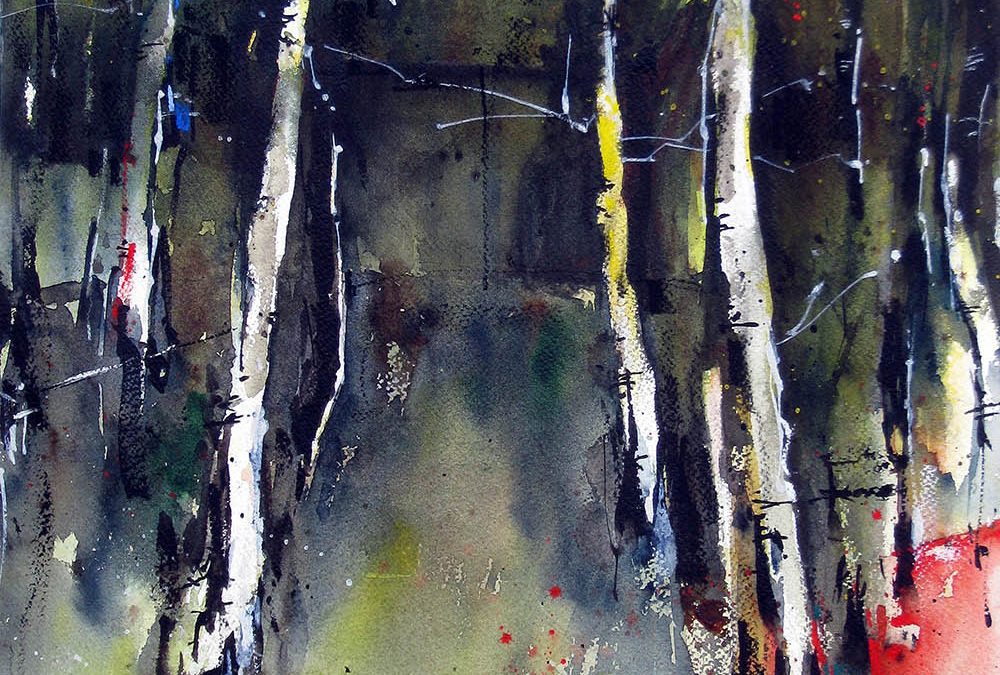 Paisaje palentino con una atmósfera acuosa de formas sinuosas. Técnica húmedo sobre húmedo propia de este medio y colores saturados.