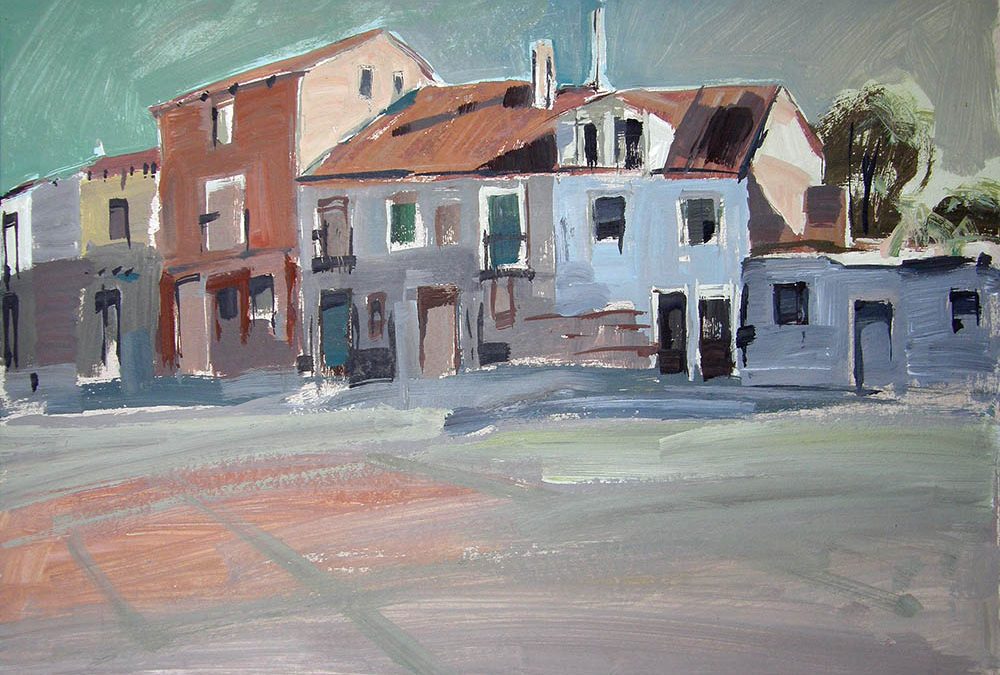 Típica plaza burgalesa representada con tonos fríos y una composición a modo de telón de fondo.