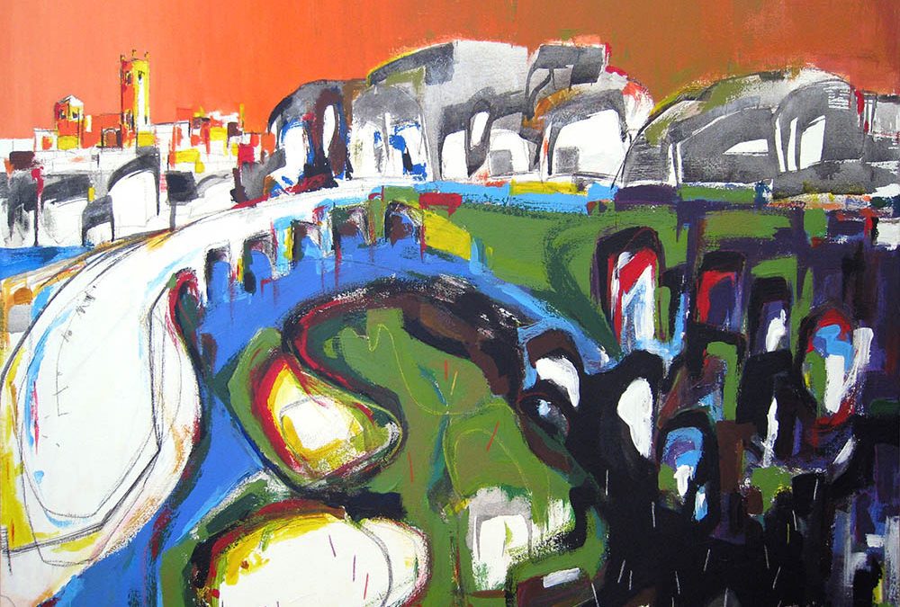 Composición abierta y colorista que representa el cauce del río Carrión a su paso por la localidad palentina.