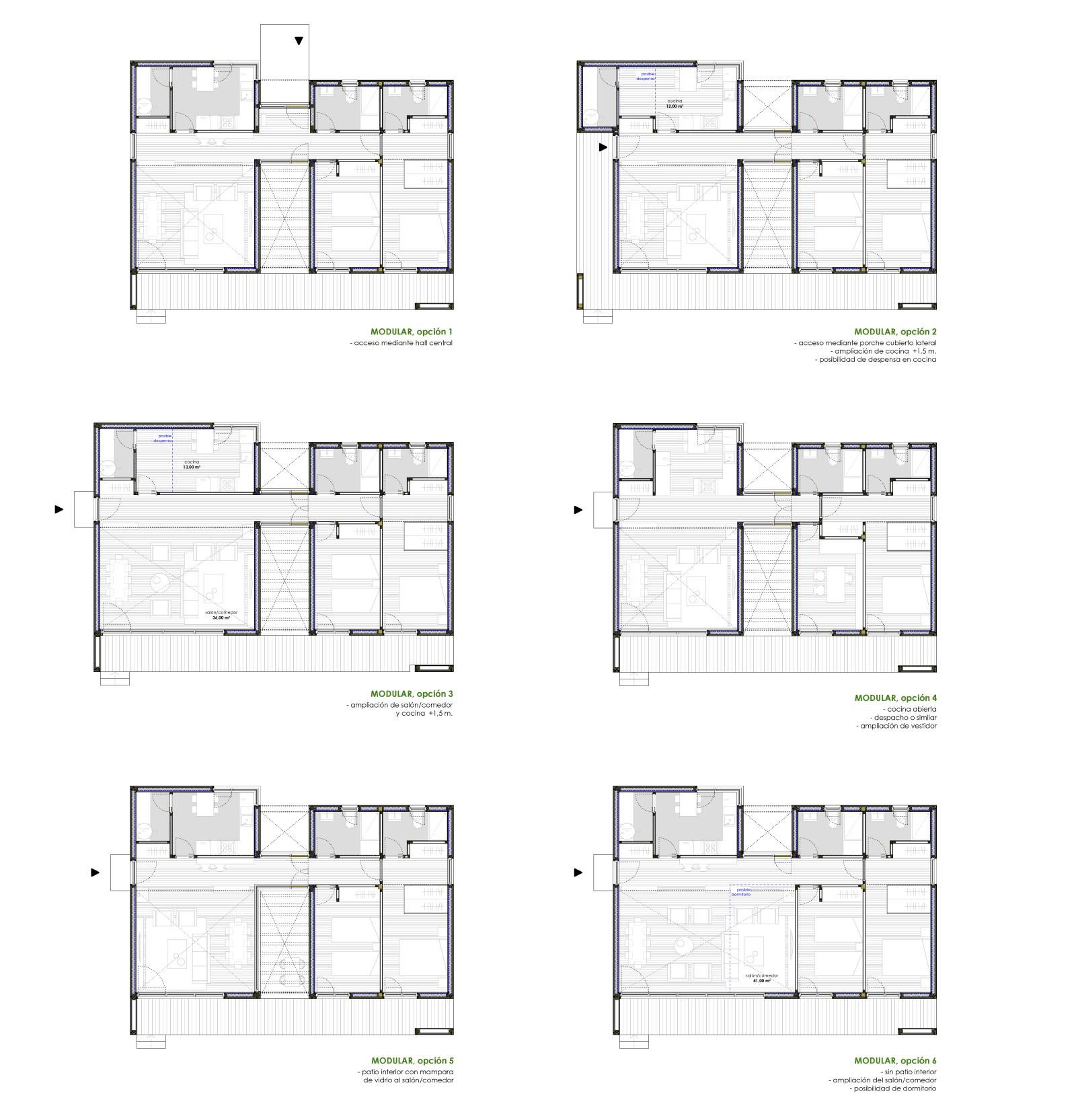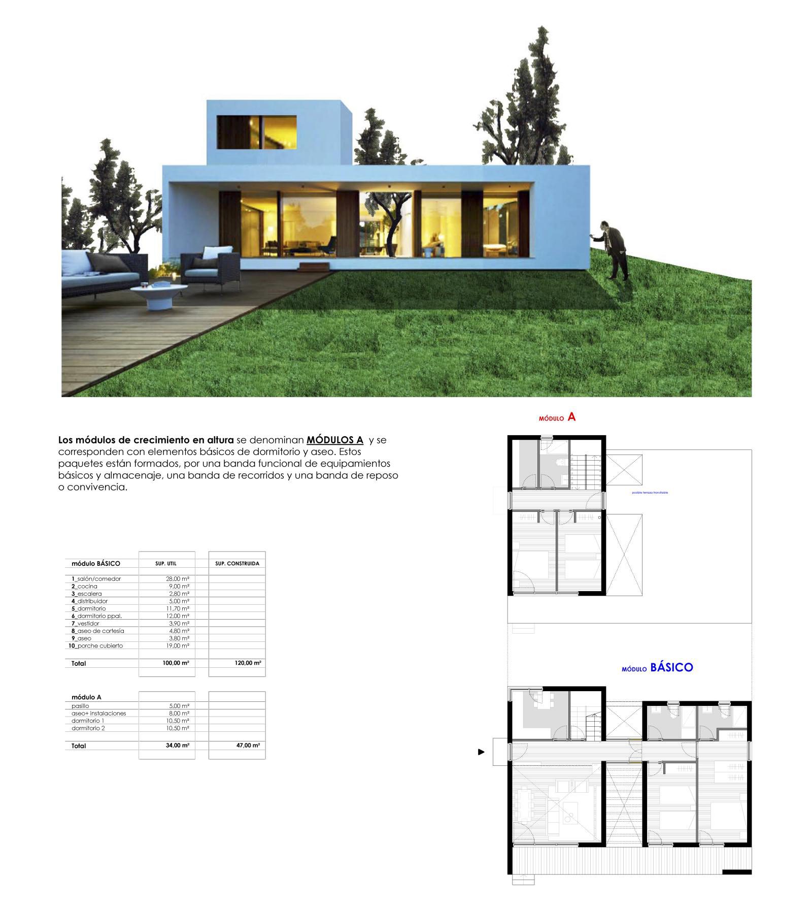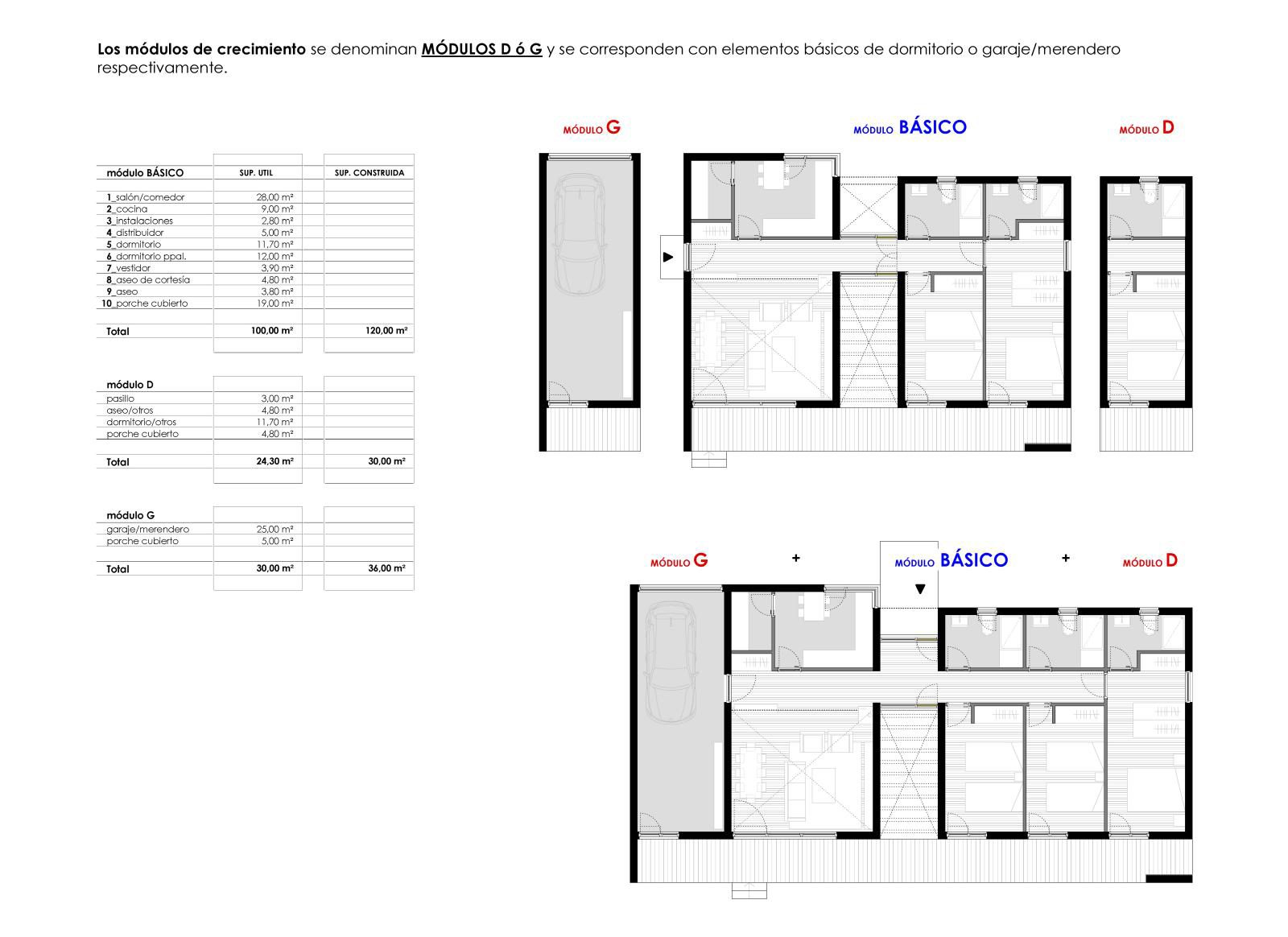 El módulo básico consta de un amplio salón/comedor con cocina abierta (puede ser cerrada), dos dormitorios dobles (uno de ellos tipo suite con vestidor y baño incorporados), aseo de cortesía, hall y despensa. Además dispone de un patio ajardinado interior con funcionamiento bioclimático y un amplio porche exterior.