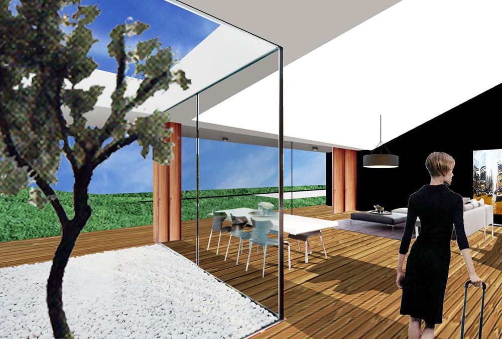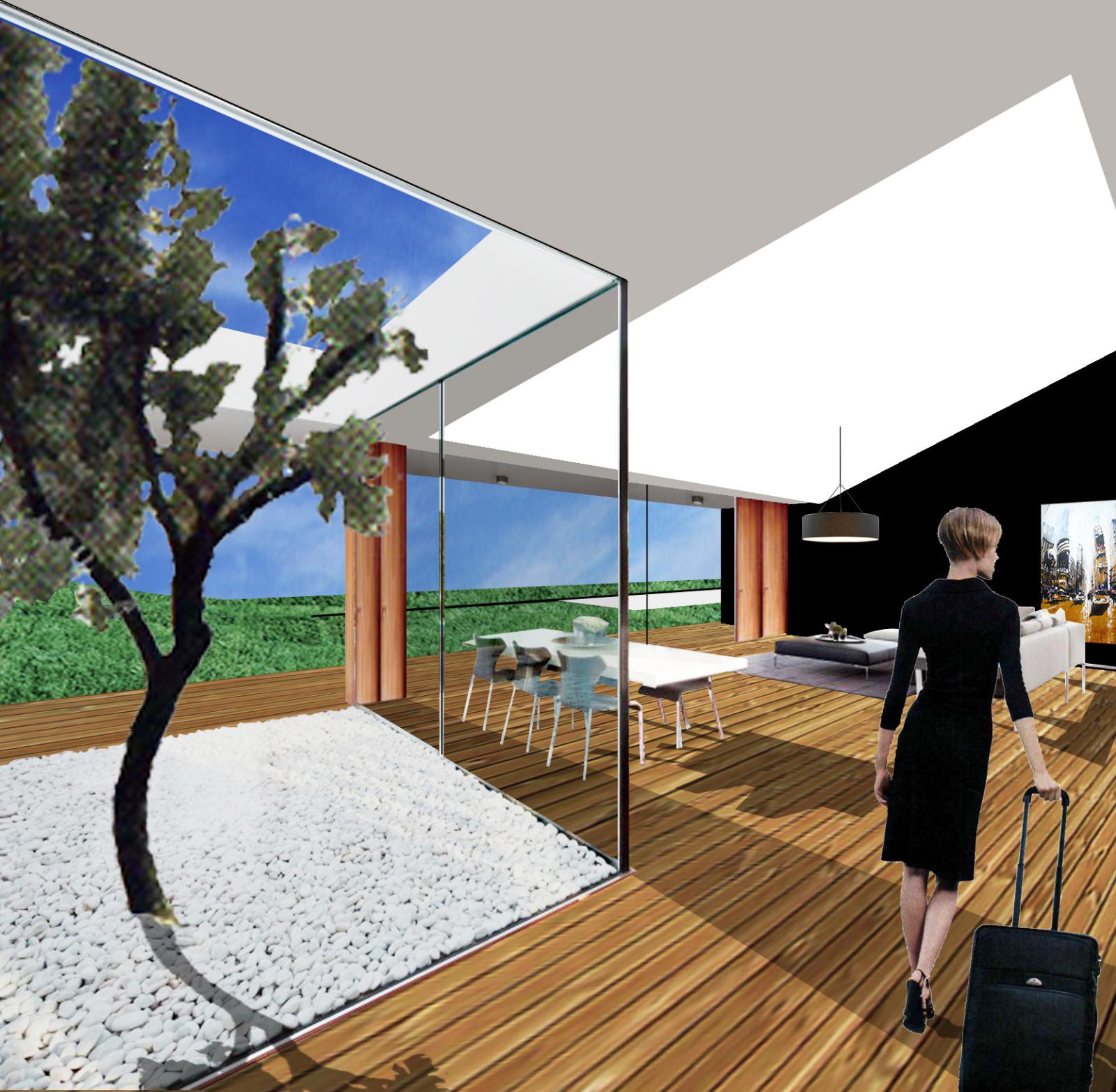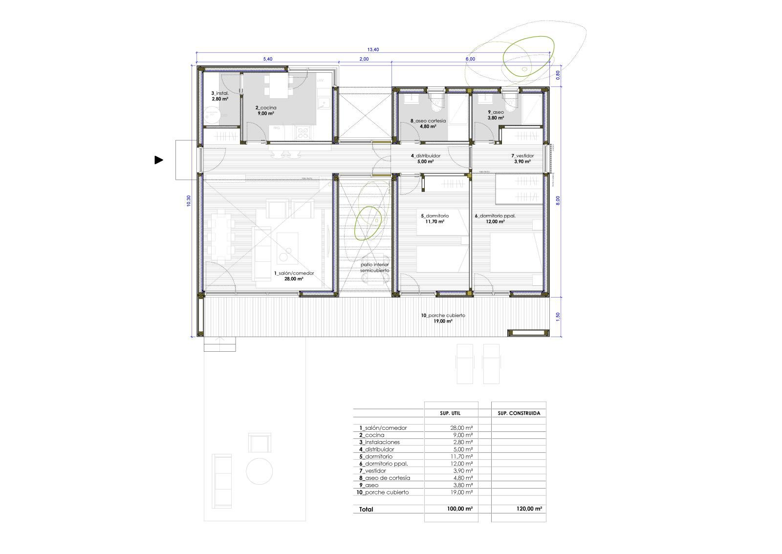 El módulo básico consta de un amplio salón/comedor con cocina abierta (puede ser cerrada), dos dormitorios dobles (uno de ellos tipo suite con vestidor y baño incorporados), aseo de cortesía, hall y despensa. Además dispone de un patio ajardinado interior con funcionamiento bioclimático y un amplio porche exterior.