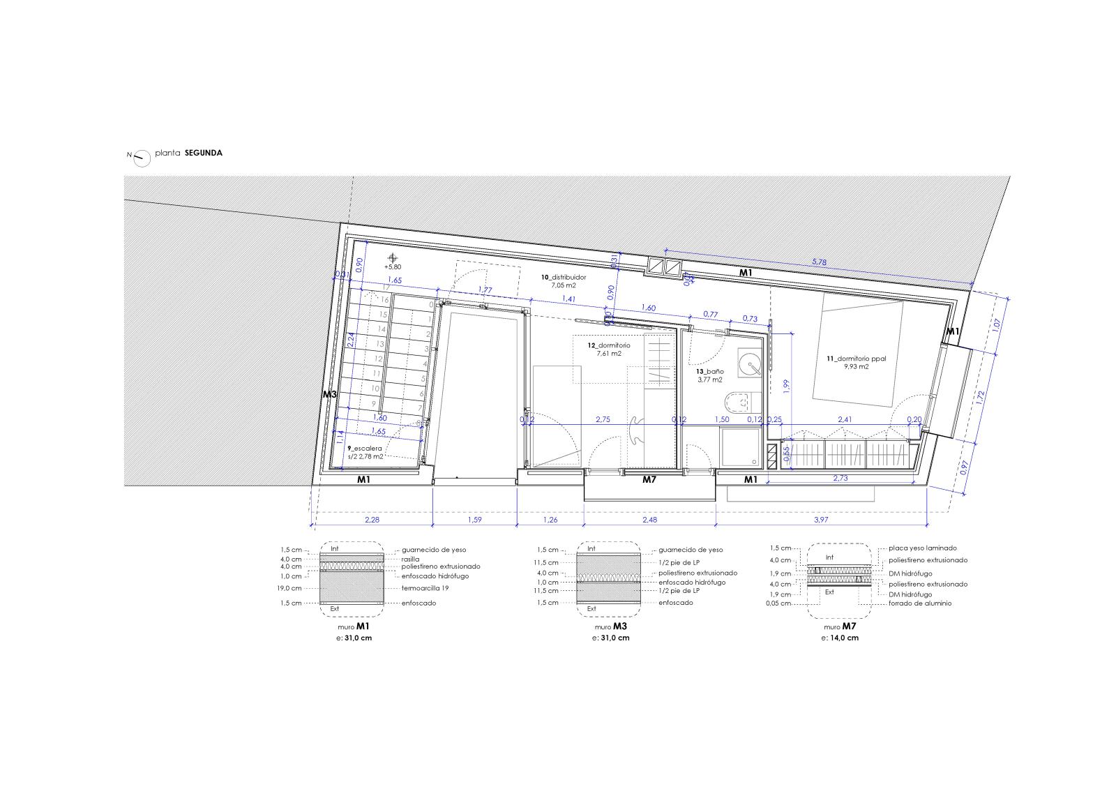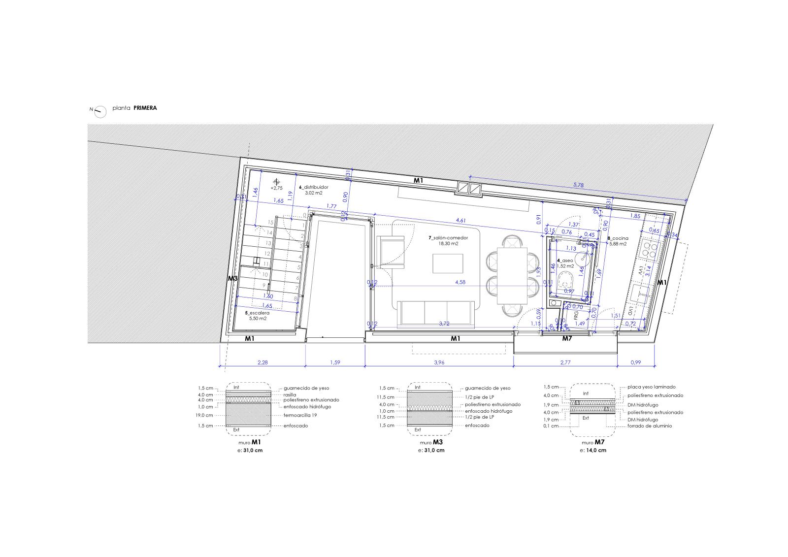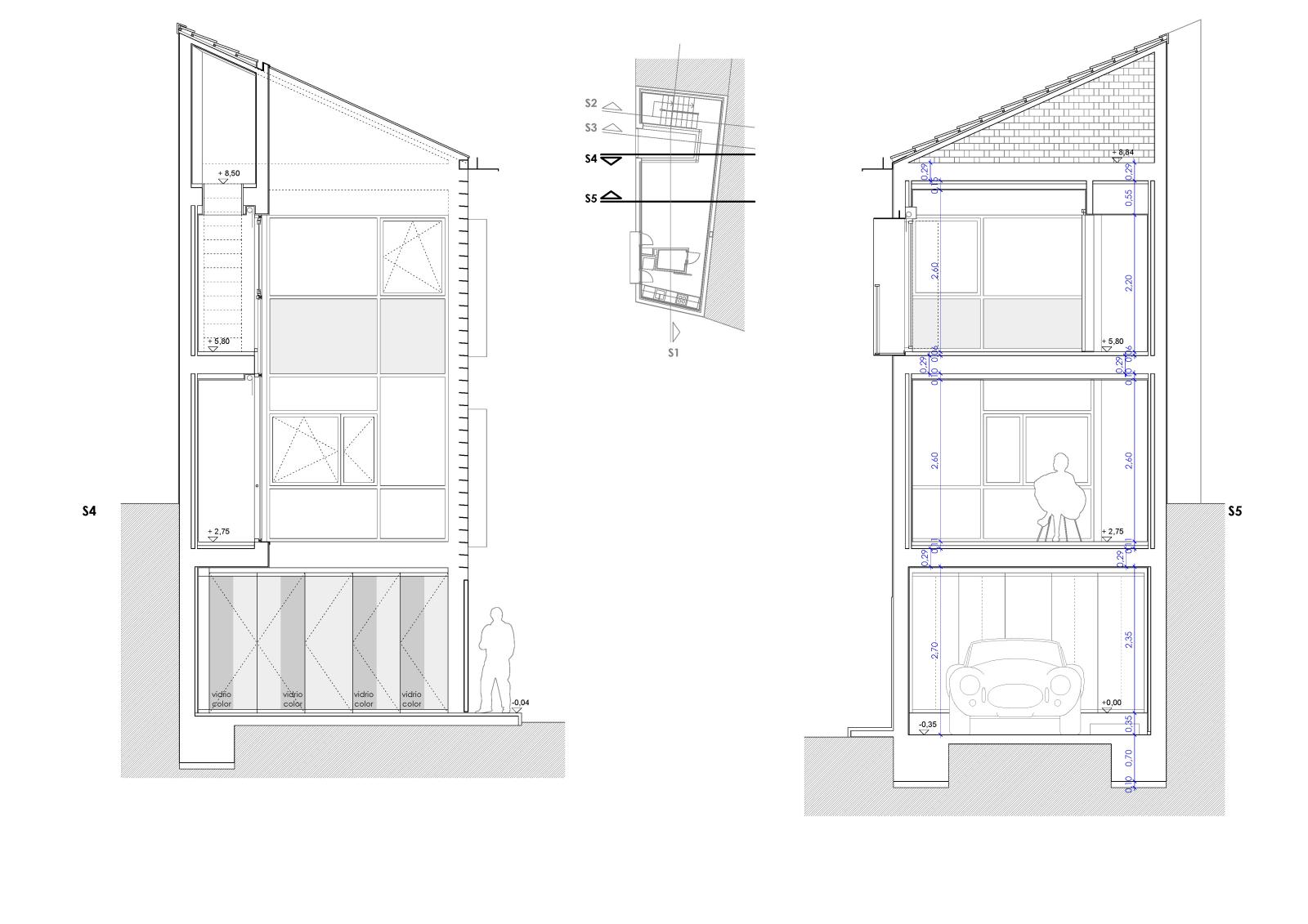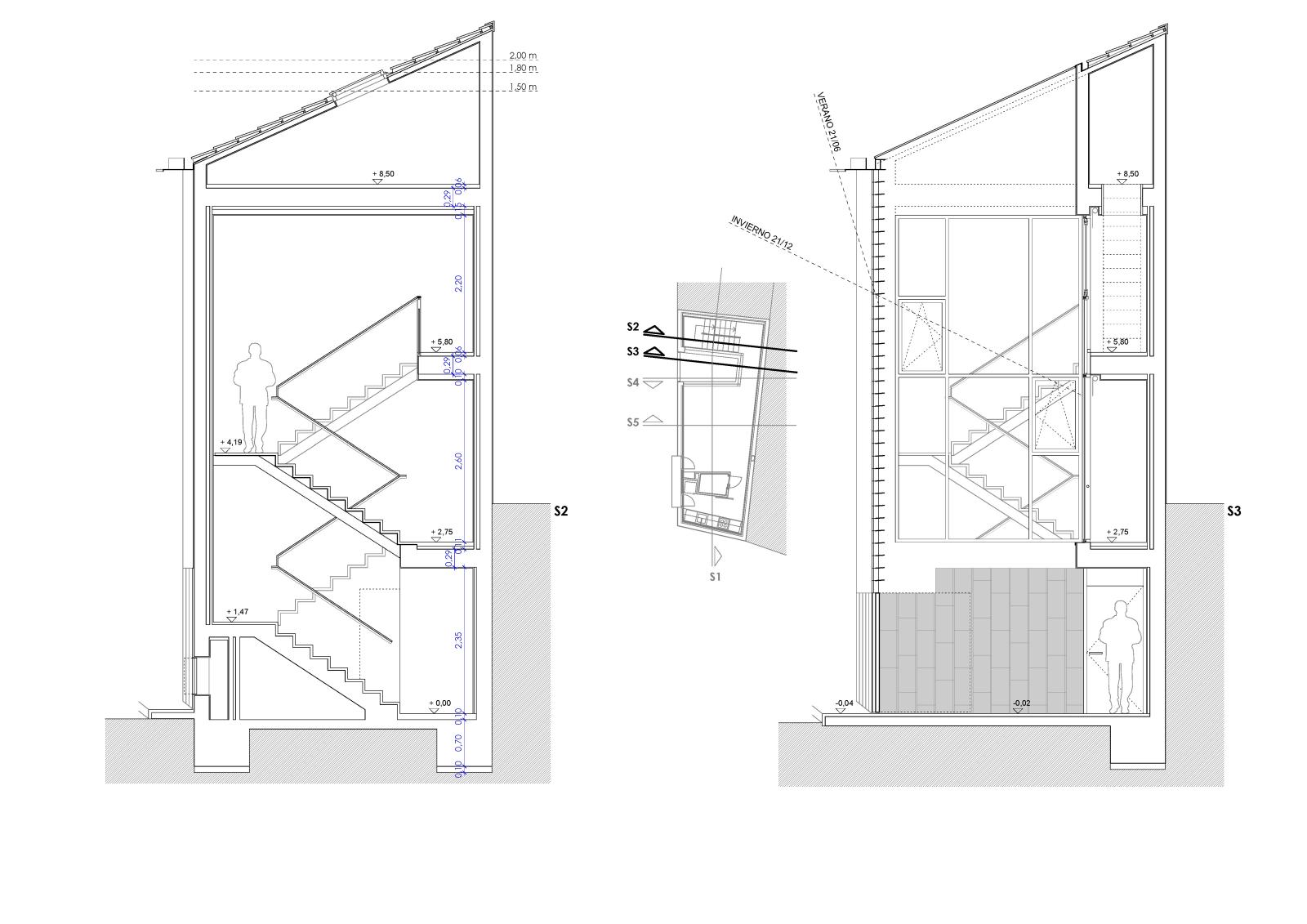 El programa de la vivienda se desarrolla de la siguiente forma: En la planta baja se dispone el garaje y el patio de acceso que atraviesa en altura toda la vivienda y sirve como elemento de ventilación e iluminación. La escalera da acceso a la plantas superiores. La planta primera es la zona noble de la vivienda y en ella se distribuye el salón-comedor, la cocina y el aseo de cortesía. La segunda planta dispone de dos dormitorios y baño completo. En el espacio bajocubierta están las instalaciones.