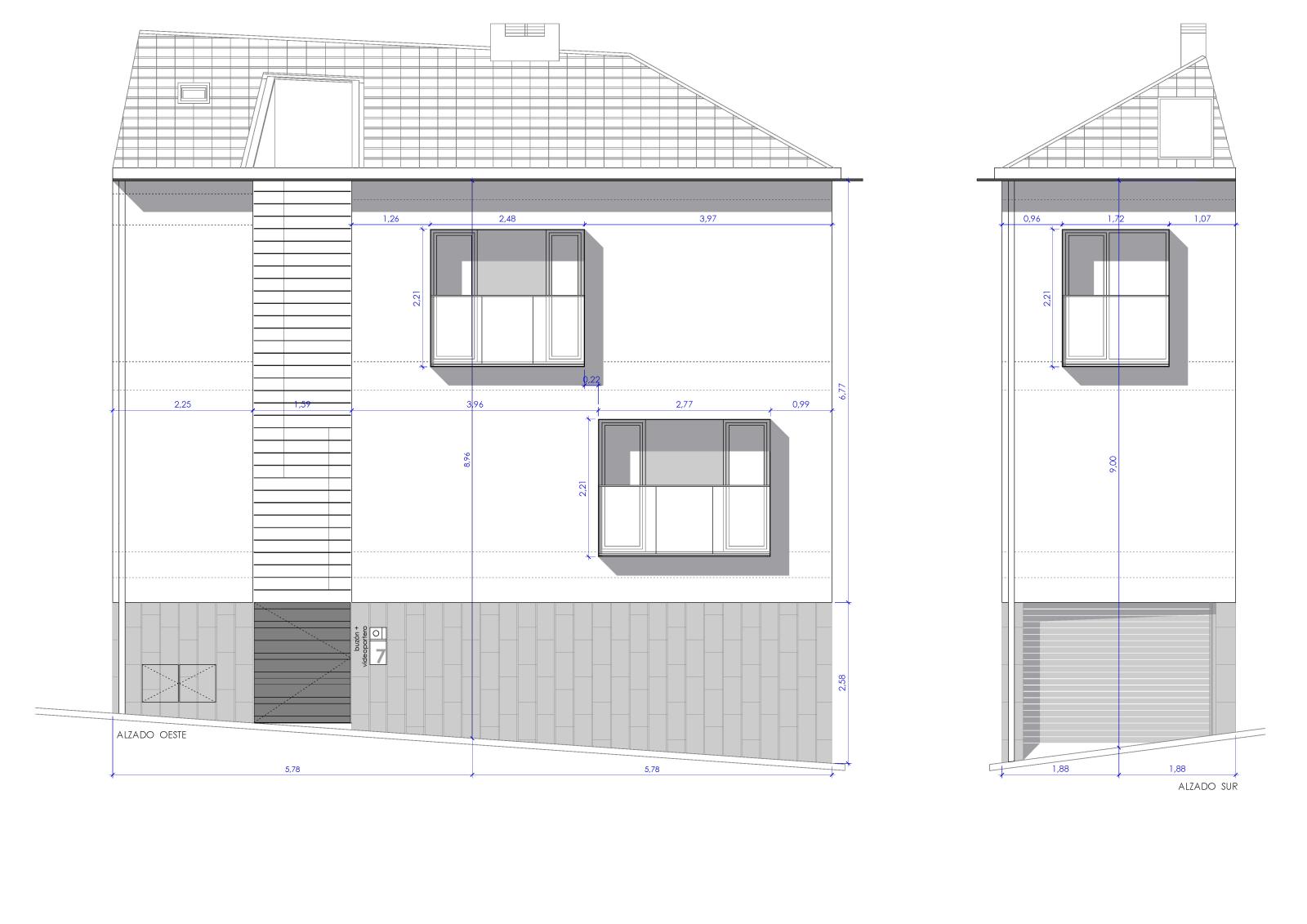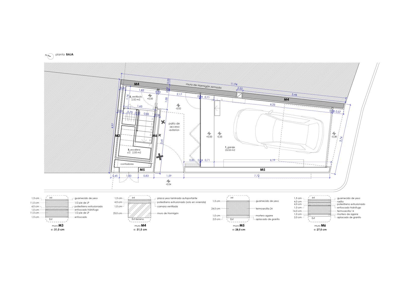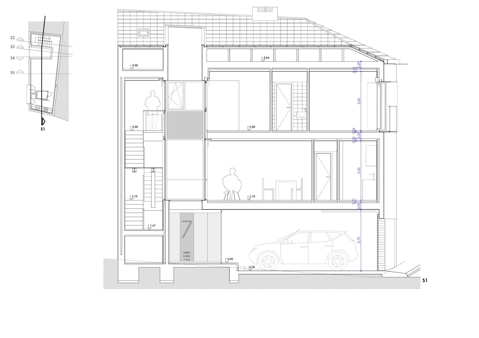 El programa de la vivienda se desarrolla de la siguiente forma: En la planta baja se dispone el garaje y el patio de acceso que atraviesa en altura toda la vivienda y sirve como elemento de ventilación e iluminación. La escalera da acceso a la plantas superiores. La planta primera es la zona noble de la vivienda y en ella se distribuye el salón-comedor, la cocina y el aseo de cortesía. La segunda planta dispone de dos dormitorios y baño completo. En el espacio bajocubierta están las instalaciones.