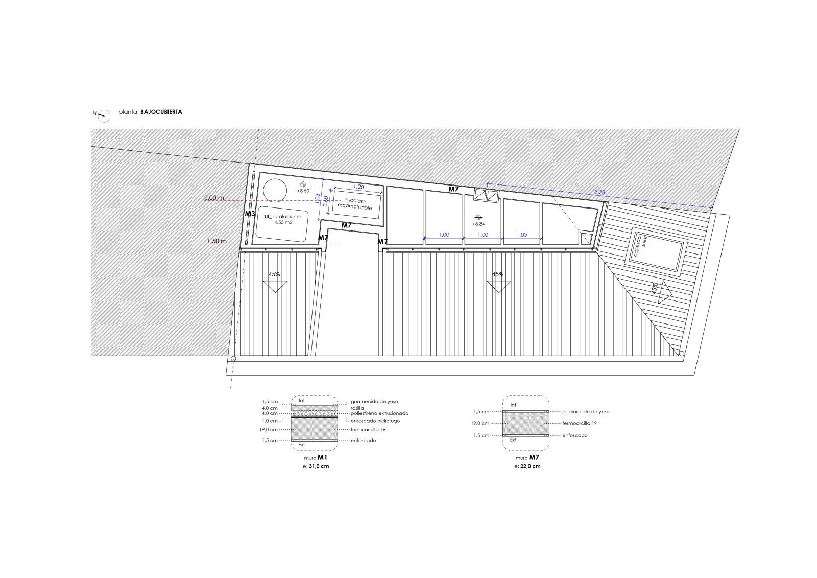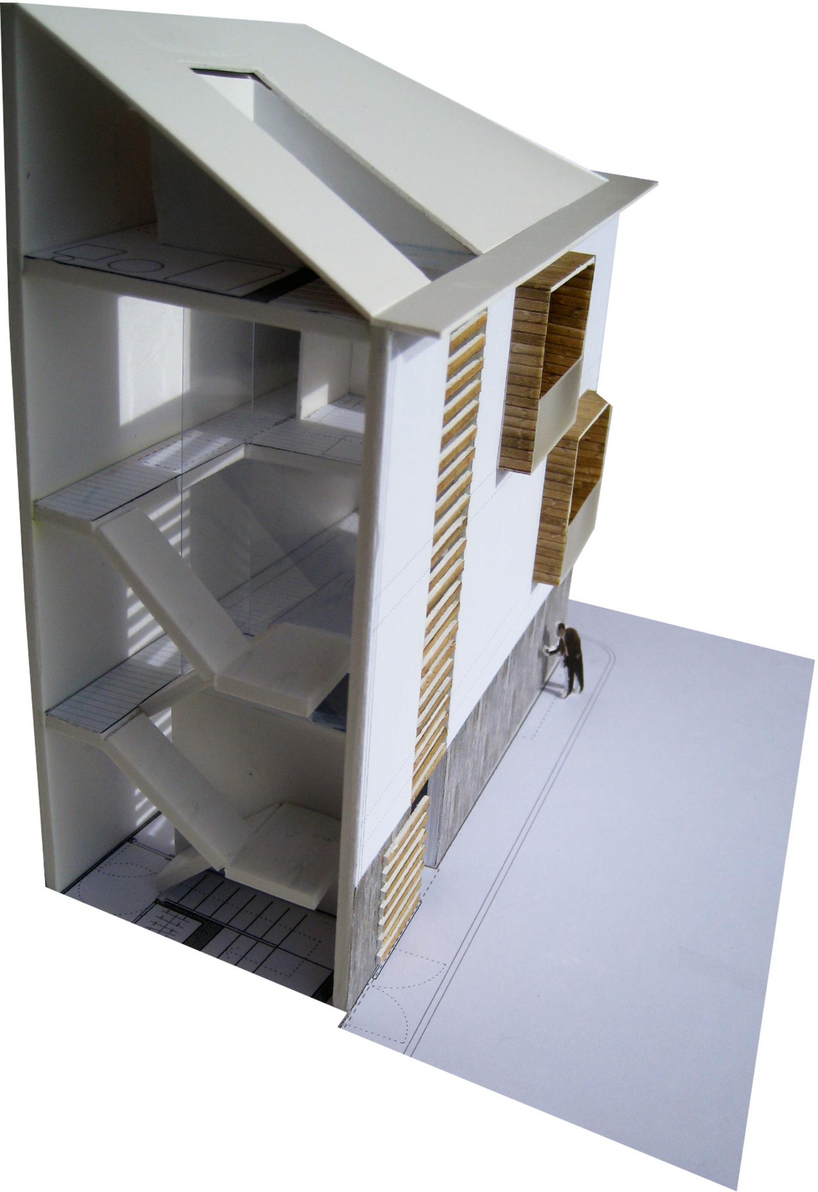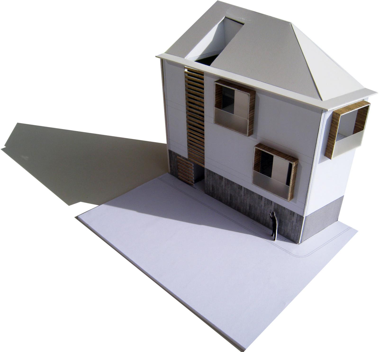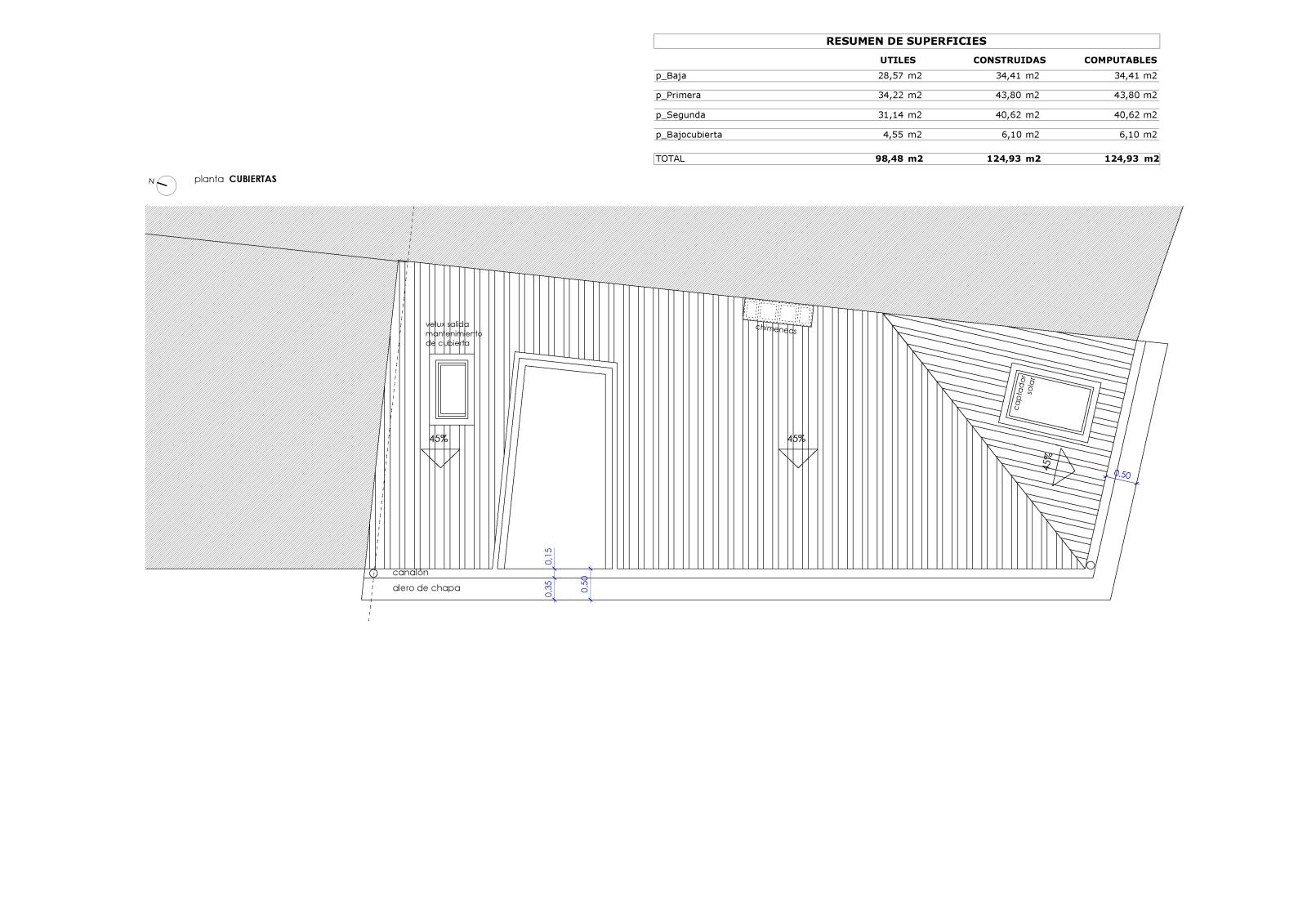 El programa de la vivienda se desarrolla de la siguiente forma: En la planta baja se dispone el garaje y el patio de acceso que atraviesa en altura toda la vivienda y sirve como elemento de ventilación e iluminación. La escalera da acceso a la plantas superiores. La planta primera es la zona noble de la vivienda y en ella se distribuye el salón-comedor, la cocina y el aseo de cortesía. La segunda planta dispone de dos dormitorios y baño completo. En el espacio bajocubierta están las instalaciones.