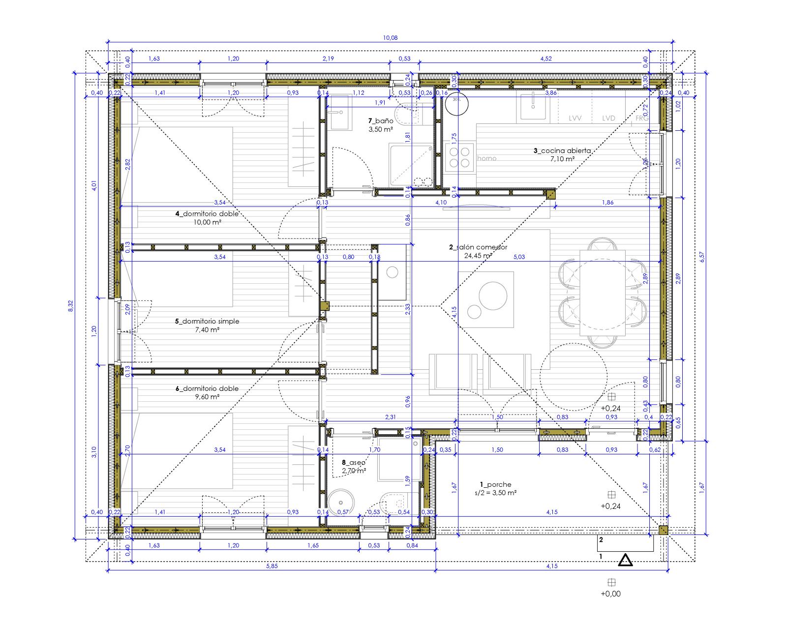 El programa del inmueble se desarrolla en una sola planta y en una única edificación. La vivienda se compone de salón-comedor, cocina abierta, baño, aseo de cortesía y tres dormitorios (dos dobles y uno sencillo). La vivienda posee un porche de acceso en la esquina suroeste del salón-comedor.