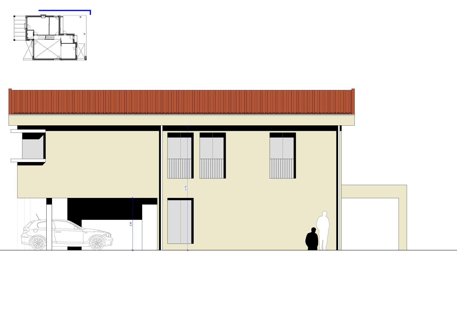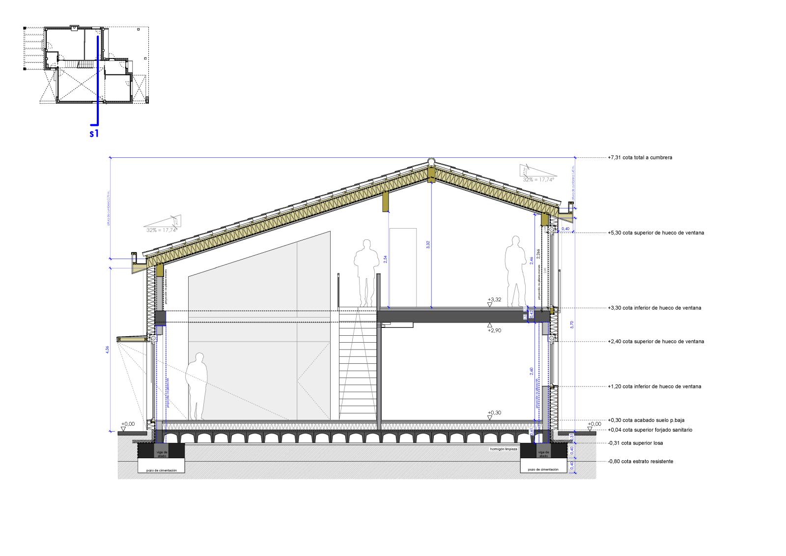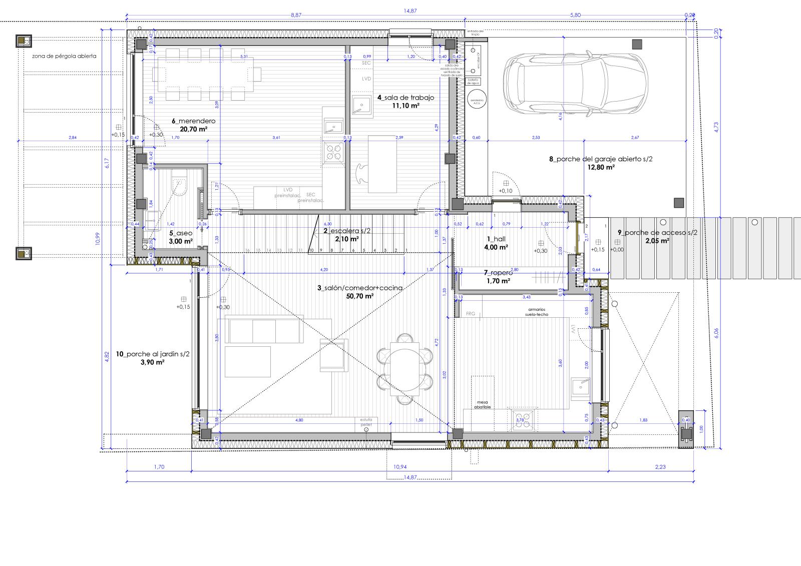 El programa de la vivienda se desarrolla para una pareja joven y funcional. Buscan espacios dinámicos y luminosos, sobre todo en las zonas de uso de día donde los espacios se abren completamente al jardín privado. Se gana en privacidad conforme nos vamos elevando. En la zona de acceso de la planta baja se disponen un garaje abierto y cubierto con 2 plazas de aparcamiento y un hall con función de almacenaje que da paso al espacio diáfano del salón/cocina/comedor. La planta baja se completa con un merendero abierto al jardín, un despacho y un aseo de cortesía. En la planta primera se distribuyen los espacios más privados como son el dormitorio sencillo y el dormitorio principal con vestidor. Una sala de juegos que vuelca al salón y un baño común completan el programa funcional.
