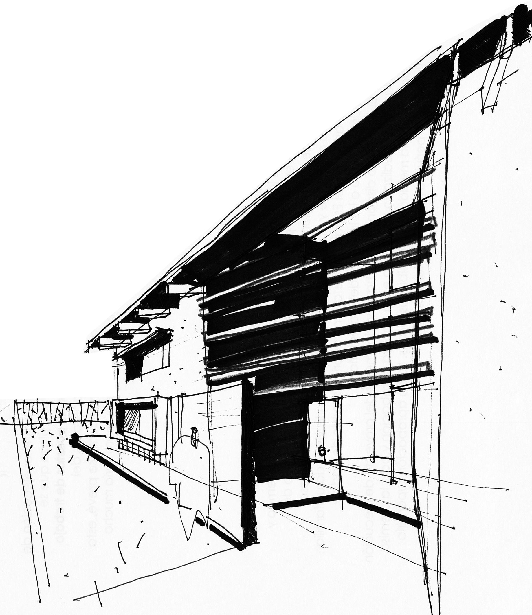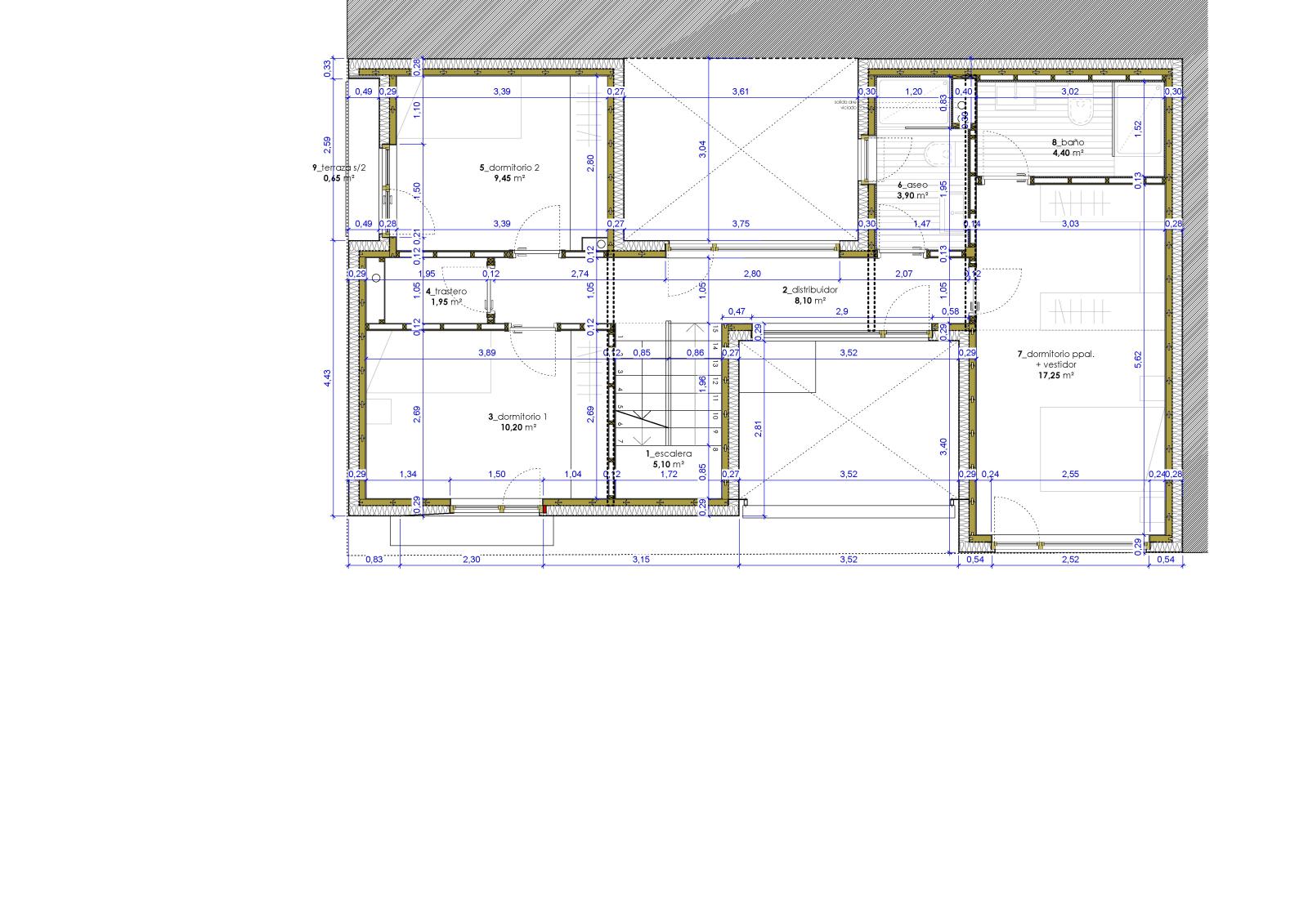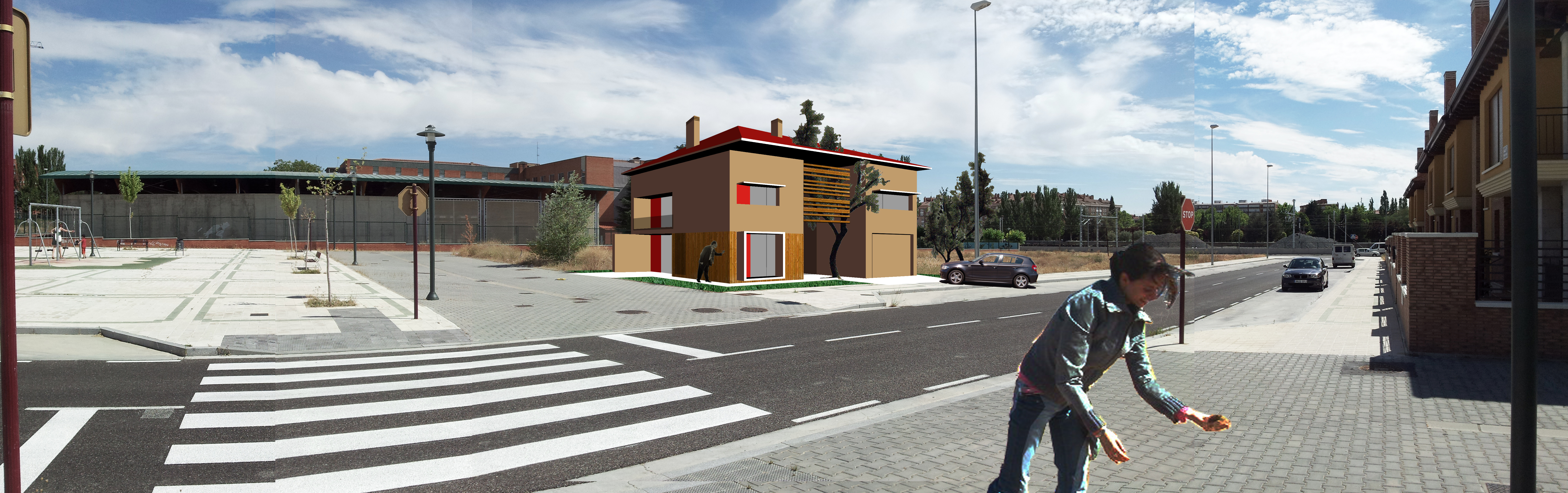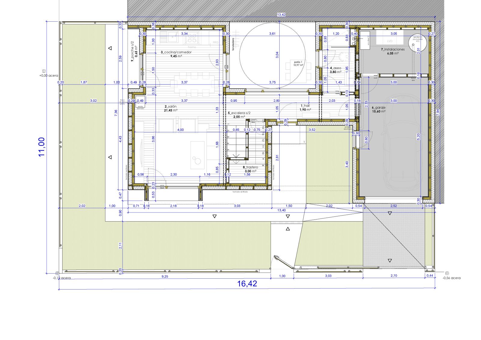 La edificación consiste en una vivienda unifamiliar entre medianeras situada en una zona de ampliación de la ciudad. El programa de la vivienda se desarrolla de la siguiente forma: En la planta baja se dispone la zona de día con un hall de acceso que vincula la zona más noble de la vivienda con las zonas de usos secundarios y por otra parte relaciona ambos patios. Este elemento que organiza espacios y recorridos da paso a un lado al salón y a la cocina/comedor que se vuelcan al jardín. Al lado opuesto del hall de acceso se sitúa el aseo de cortesía, el garaje para un vehículo y la sala de instalaciones. La escalera situada en una posición centrada en la vivienda actúa de núcleo vertical de comunicación y da paso a la primera planta donde se sitúa la zona de noche con tres dormitorios dobles, un trastero y dos baños (uno tipo suite dentro del dormitorio principal). La planta bajocubierta, está formada por un espacio diáfano a modo de despacho, zona de almacenaje y un distribuidor que da acceso. Los dos vacíos que atraviesan la vivienda en toda su altura definen las relaciones espaciales generando distintas privacidades, visuales y ámbitos formales.