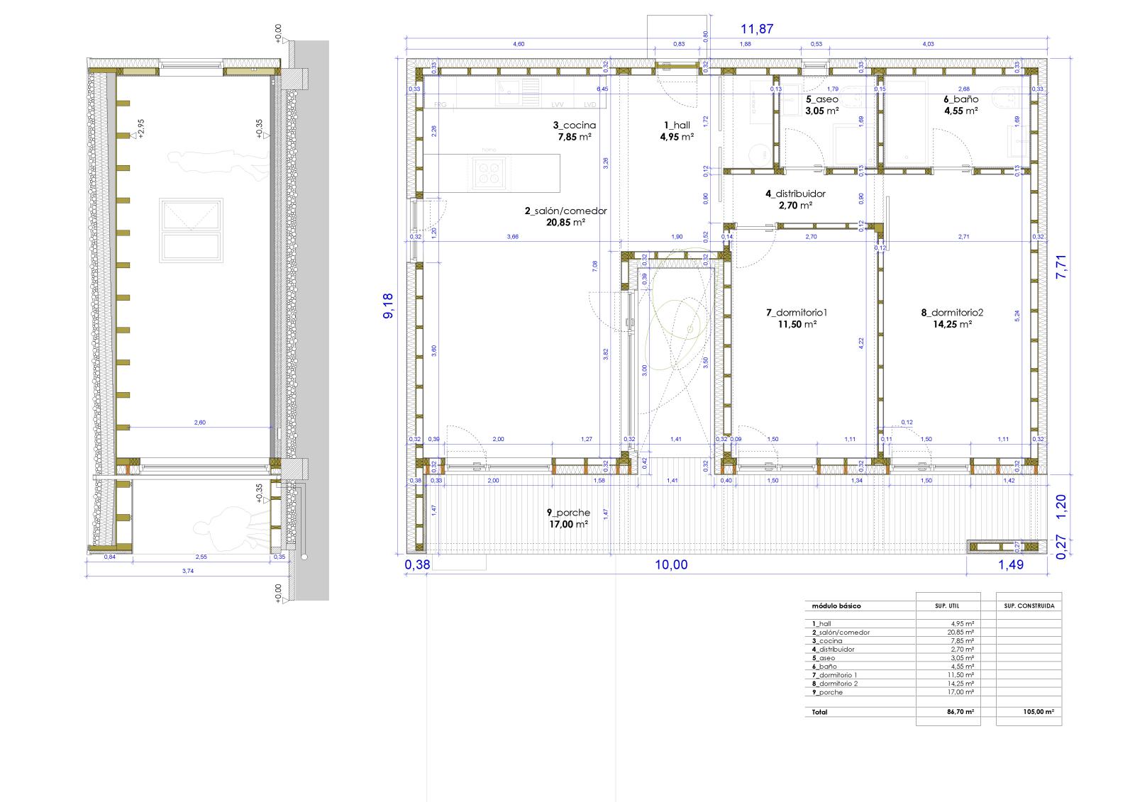 Vivienda de estética actual que consta de un amplio salón/comedor con cocina abierta, dos dormitorios dobles (uno de ellos tipo suite con baño incorporado), aseo de cortesía, hall y despensa. Además dispone de un patio ajardinado interior con funcionamiento bioclimático y un amplio porche exterior al sur.