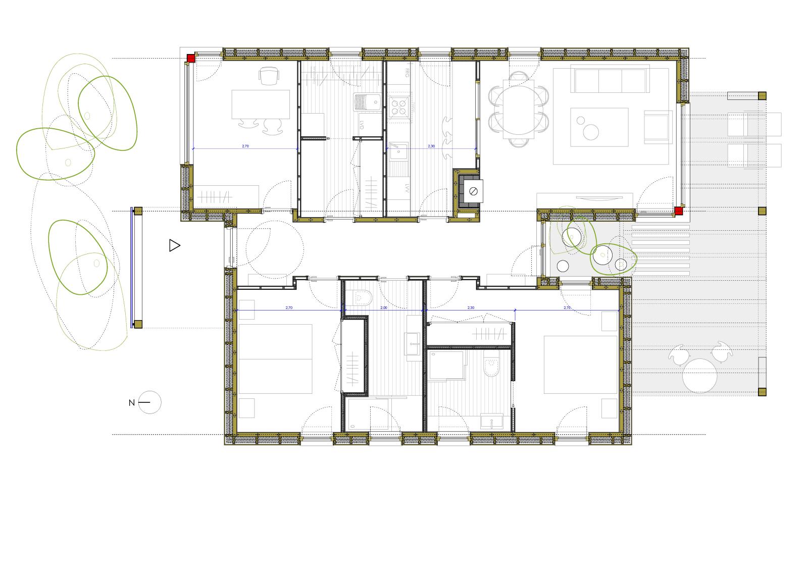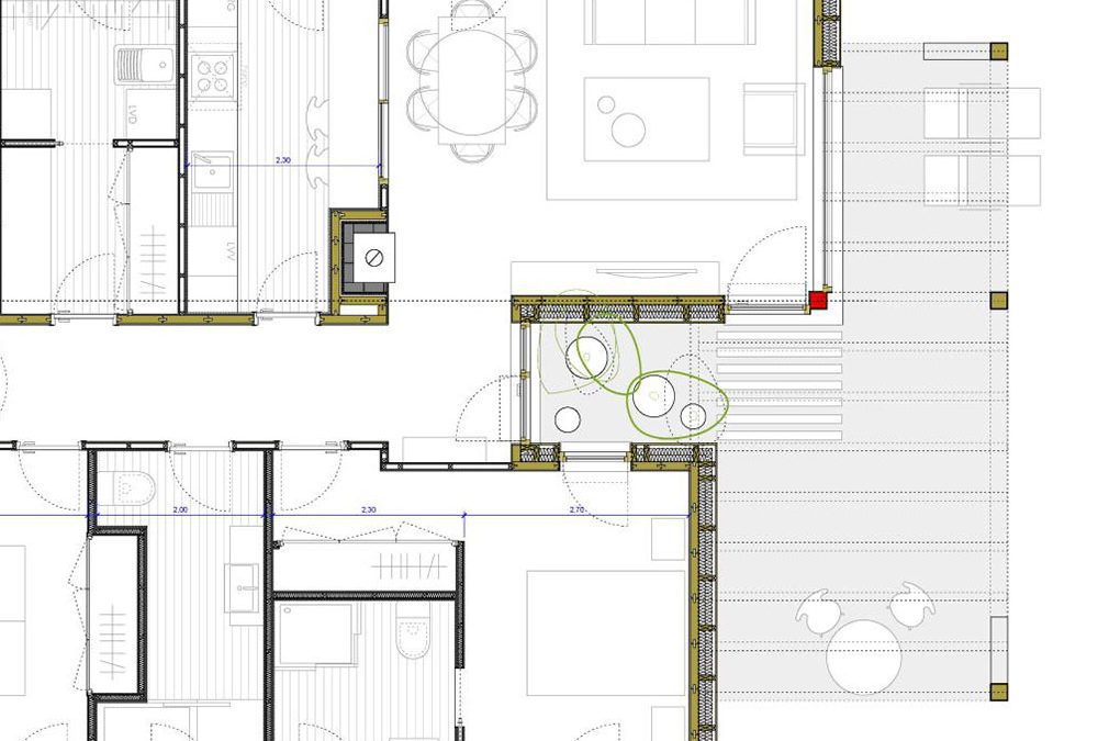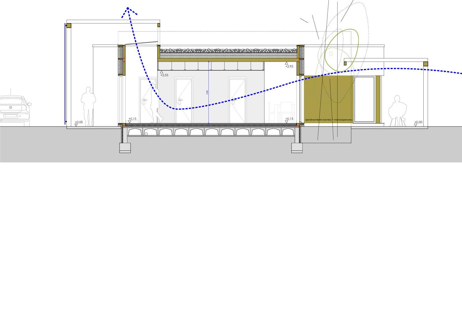 Vivienda unifamiliar aislada que incorpora múltiples elementos que posibilitan el funcionamiento bioclimático de la vivienda: la orientación óptima, las ventilaciones naturales cruzadas, el patio interior como regulador higrotérmico, el porche que evita el sobrecalentamiento de la vivienda debido a la radiación directa en verano pero que permite ganancias energéticas en invierno, el forjado sanitario, la continuidad del aislamiento, el captador solar en cubierta para a.c.s, la caldera de biomasa, la recuperación de las aguas pluviales para su reutilización o la masiva utilización de materiales reciclados o reciclables son algunas características bioclimáticas y/o sostenibles implementadas.