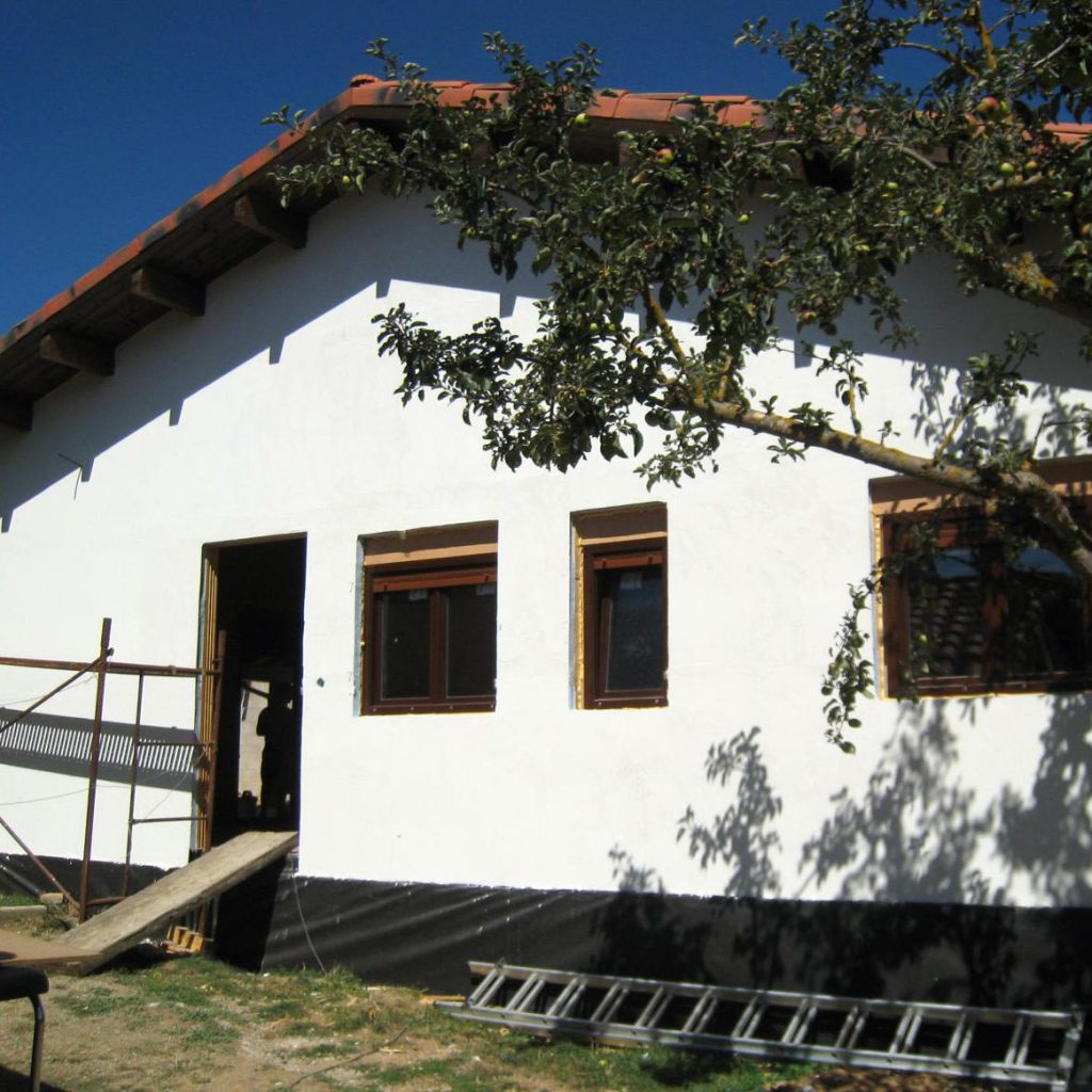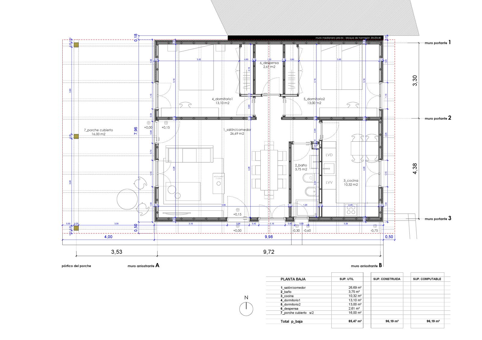 El programa lo forman un amplio salón-comedor, cocina, despensa, baño completo y dos dormitorios dobles. El porche exterior cubierto al oeste completa la distribución.