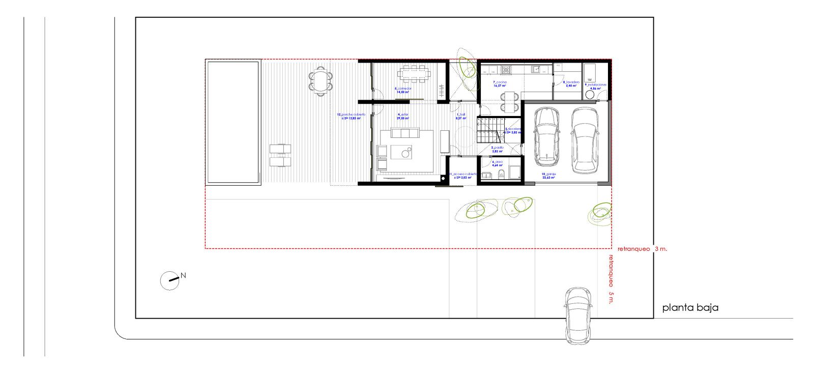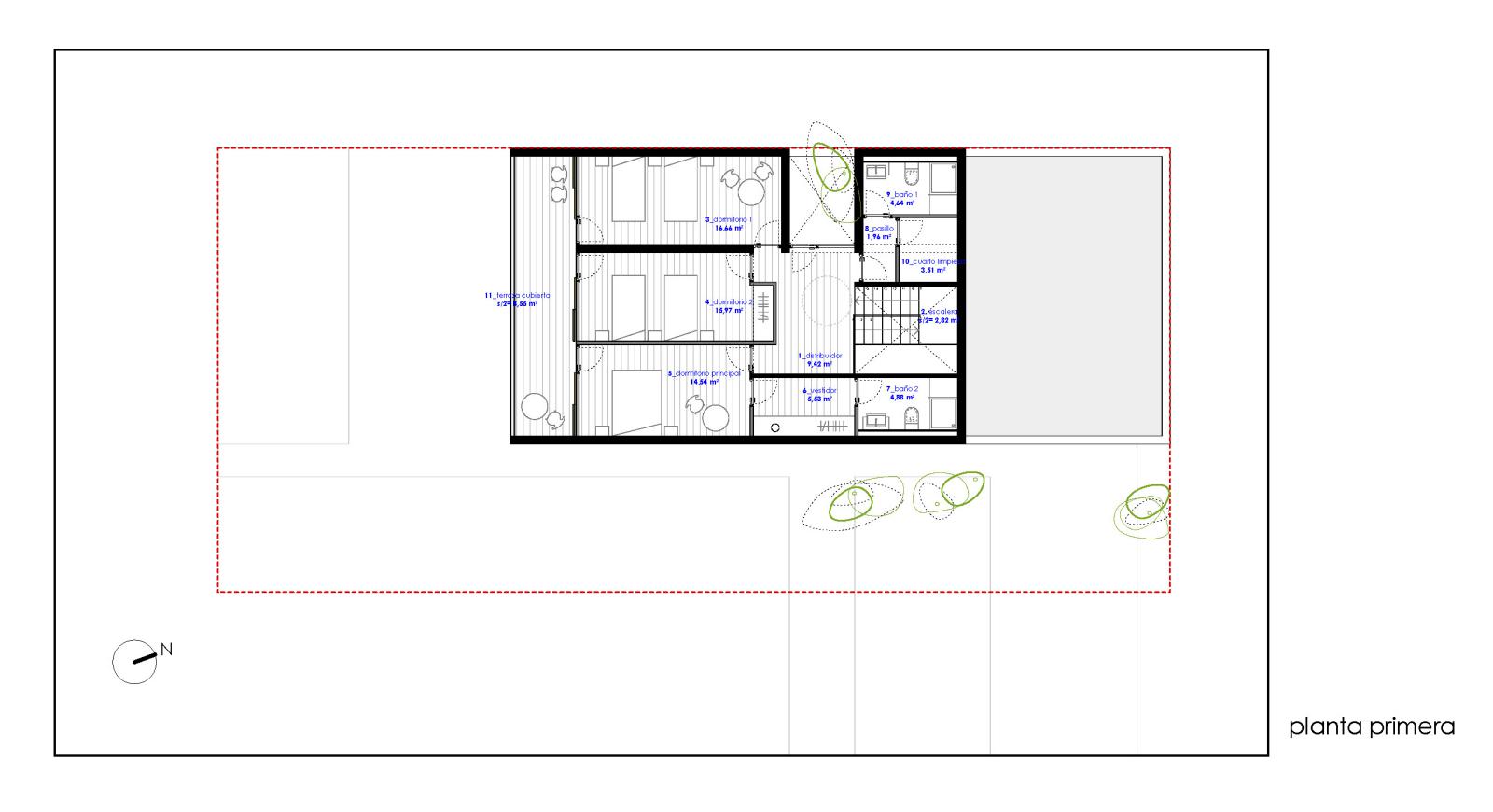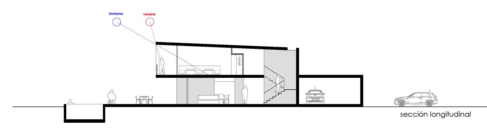Vivienda unifamiliar aislada que incorpora múltiples elementos que posibilitan el funcionamiento bioclimático de la vivienda: la orientación óptima, las ventilaciones naturales cruzadas, el patio interior como regulador higrotérmico, el porche que evita el sobrecalentamiento de la vivienda debido a la radiación directa en verano pero que permite ganancias energéticas en invierno, el forjado sanitario, la continuidad del aislamiento, el captador solar en cubierta para a.c.s, la caldera de biomasa, la recuperación de las aguas pluviales para su reutilización o la masiva utilización de materiales reciclados o reciclables son algunas características bioclimáticas y/o sostenibles implementadas.