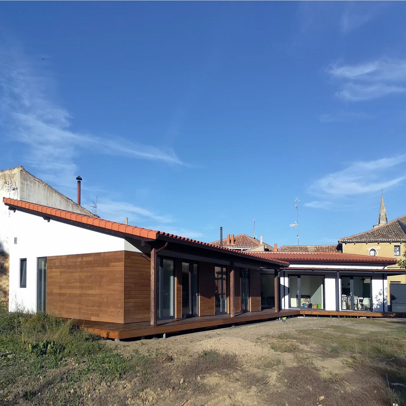 Promoción de viviendas unifamiliares pareadas bajo el modelo ECO80 revisado para su ampliación mediante módulos D1. Vivienda unifamiliar de estética rústica cuya distribución consta de un […]Casa N. Monzón (Palencia)